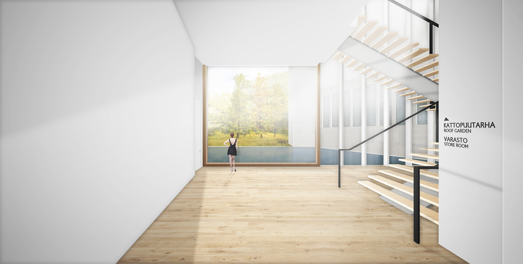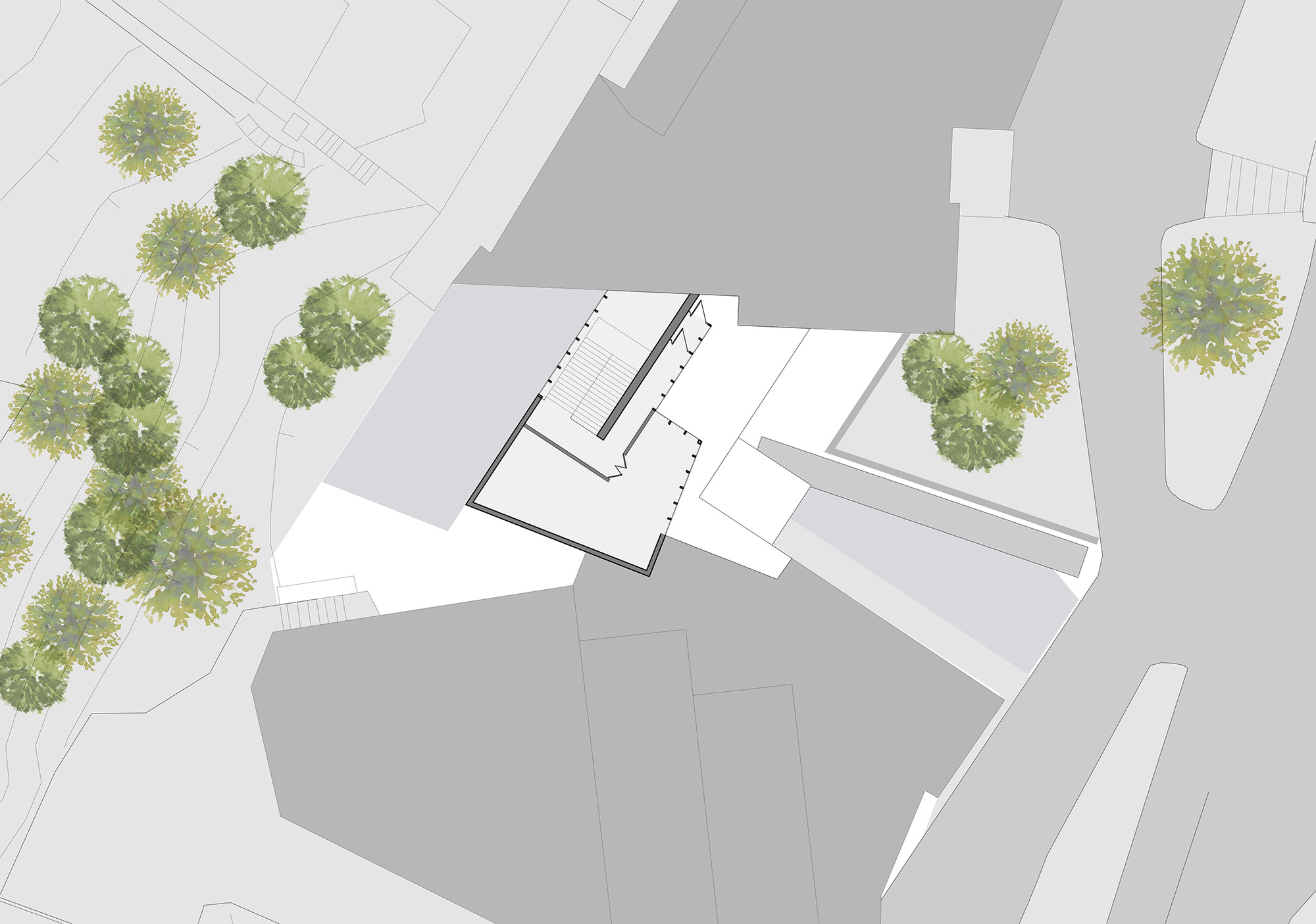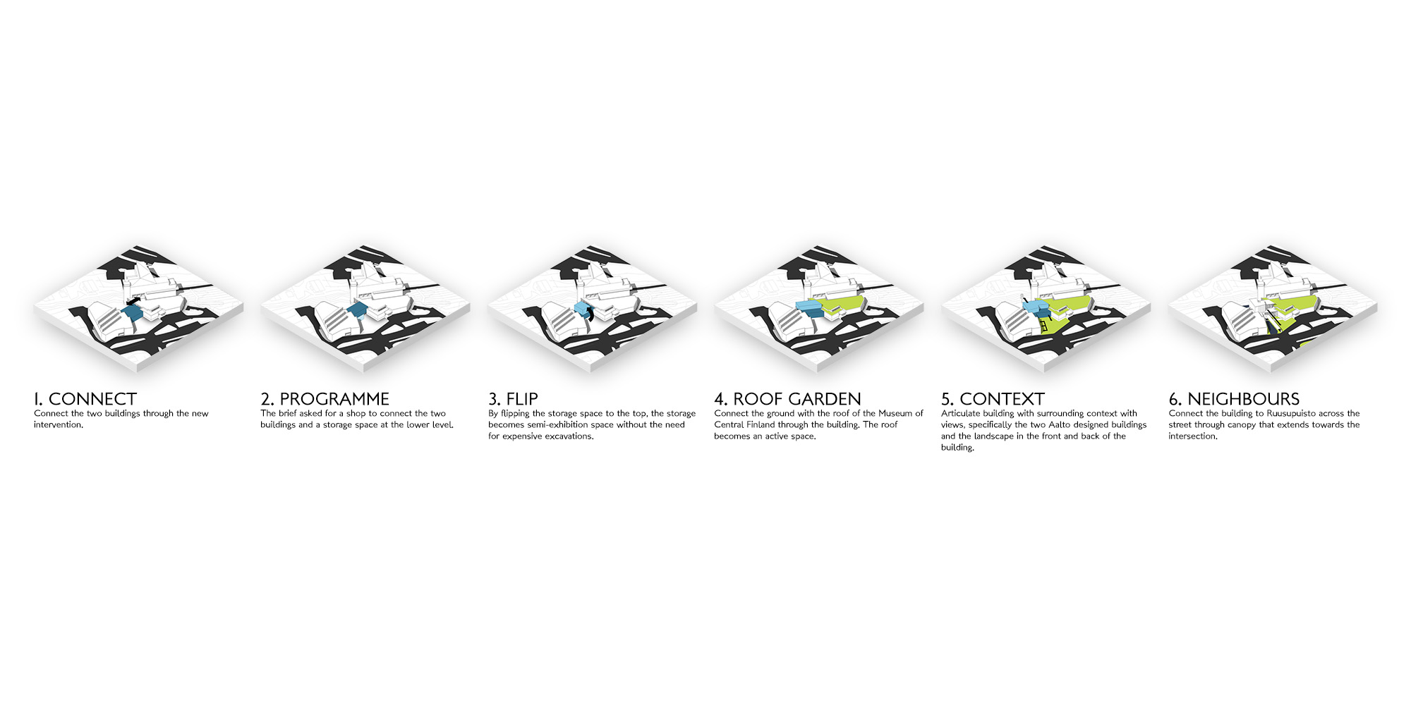 Contrary to the brief, which asked for the shop to be situated above the storage space, the design for the new extension inverts this arrangement to place the storage space at the top and the shop at the bottom. The benefits of this is the shop connects the communal spaces of the two existing buildings, thus making circulation more ideal, as well as minimizing the need for expensive excavation. At night, the white opaque glass box on top becomes a beacon for the complex, turning the mundane storage space into a celebrated centrepiece. By raising the upper floor of the building to the same level as the Museum of Central Finland, the roof of that building could be turned into a roof garden, thus extending the landscape from the street onto the building.
