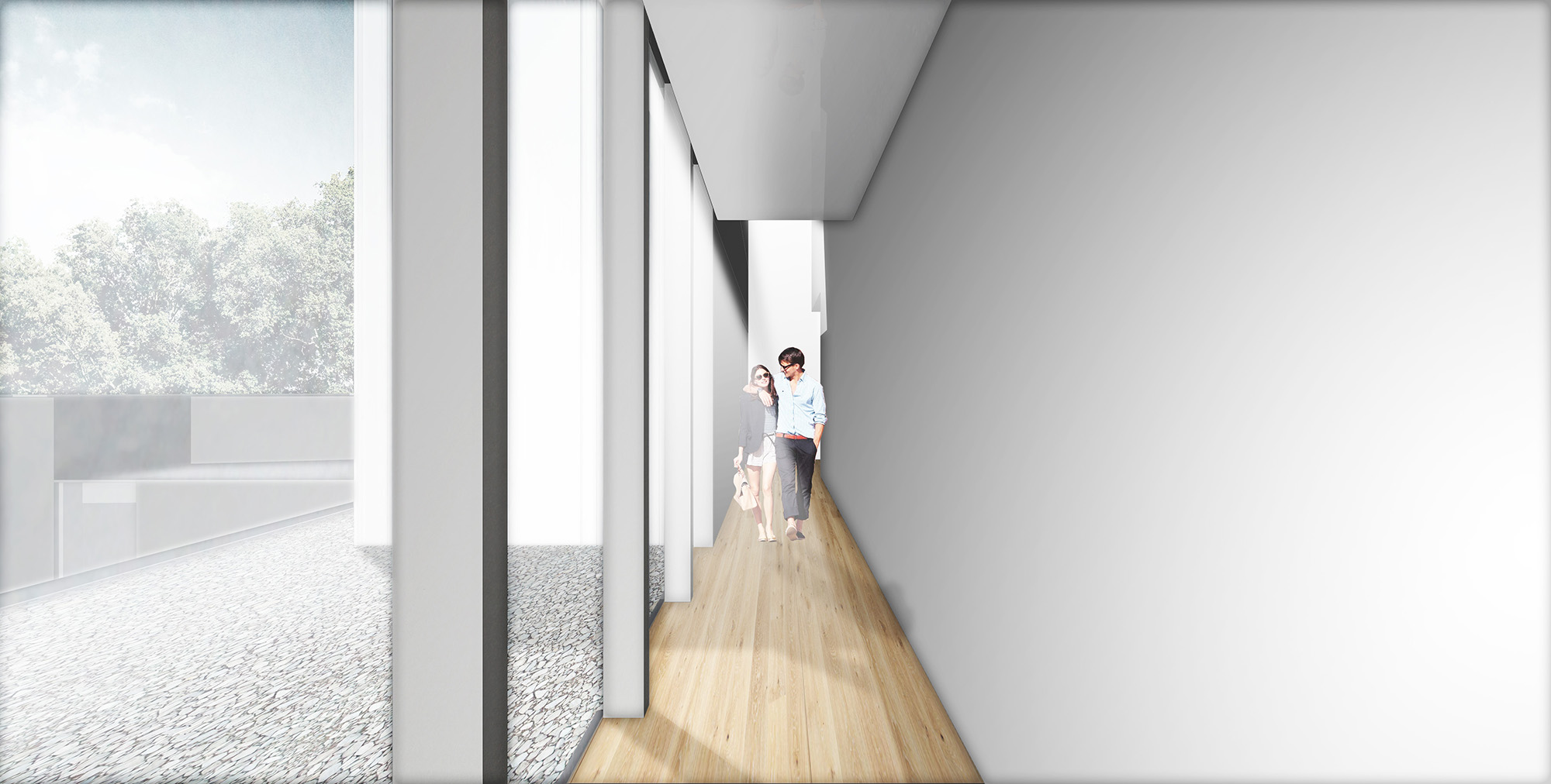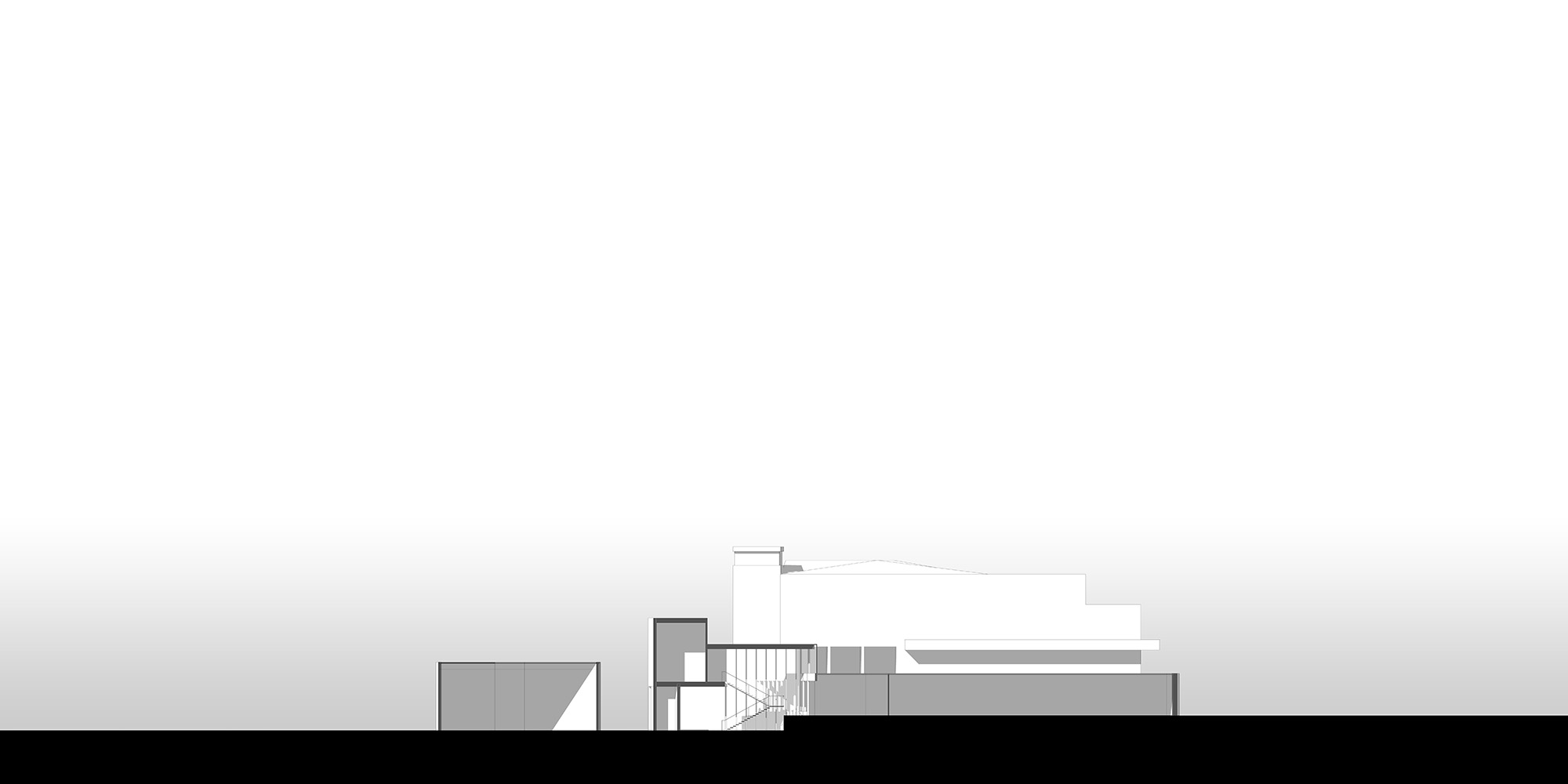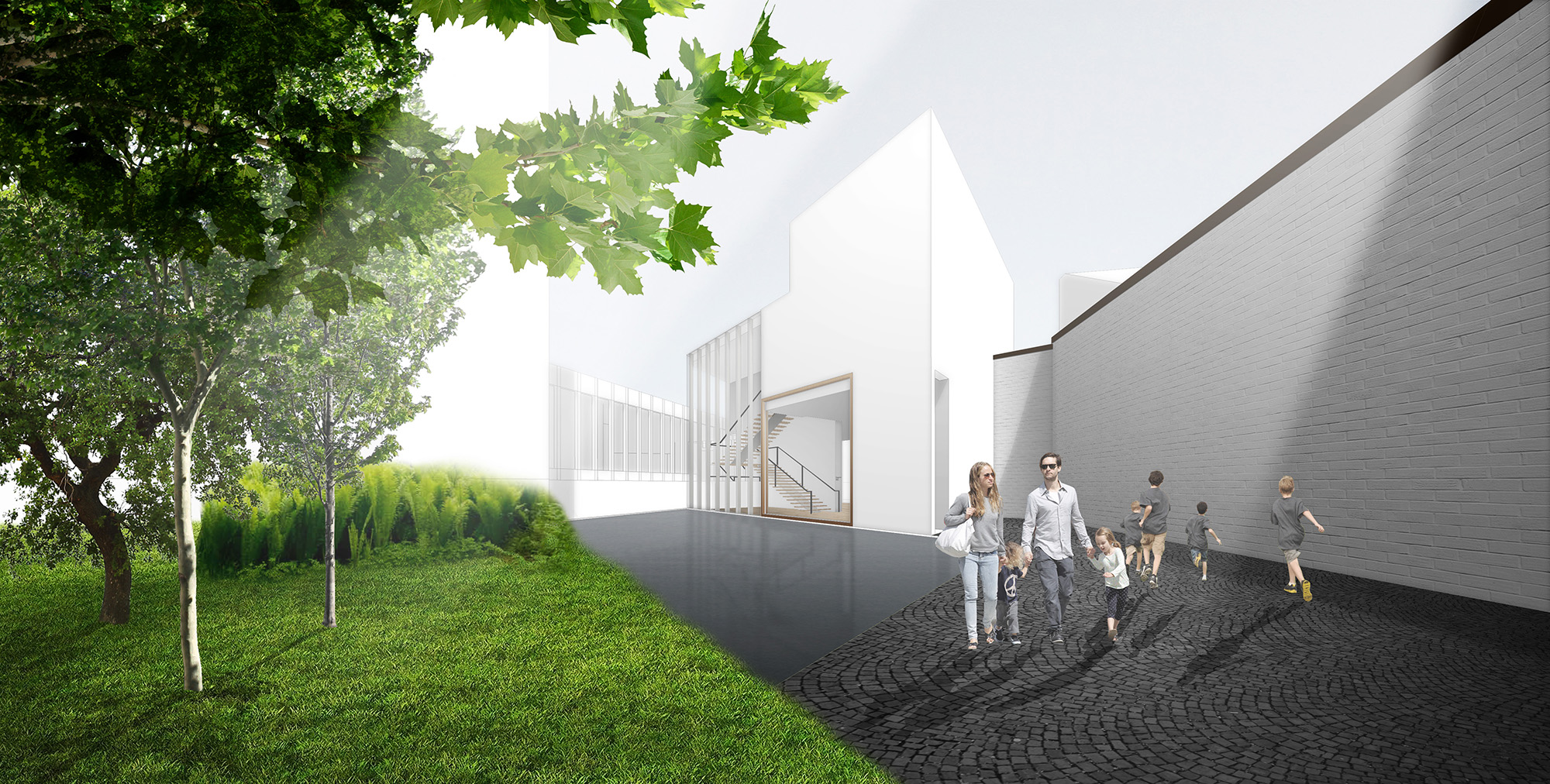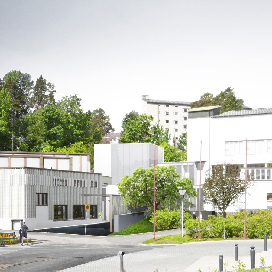 Contrary to the brief, which asked for the shop to be situated above the storage space, the design for the new extension inverts this arrangement to place the storage space at the top and the shop at the bottom. The benefits of this is the shop connects the communal spaces of the two existing buildings, thus making circulation more ideal, as well as minimizing the need for expensive excavation. At night, the white opaque glass box on top becomes a beacon for the complex, turning the mundane storage space into a celebrated centrepiece. By raising the upper floor of the building to the same level as the Museum of Central Finland, the roof of that building could be turned into a roof garden, thus extending the landscape from the street onto the building.