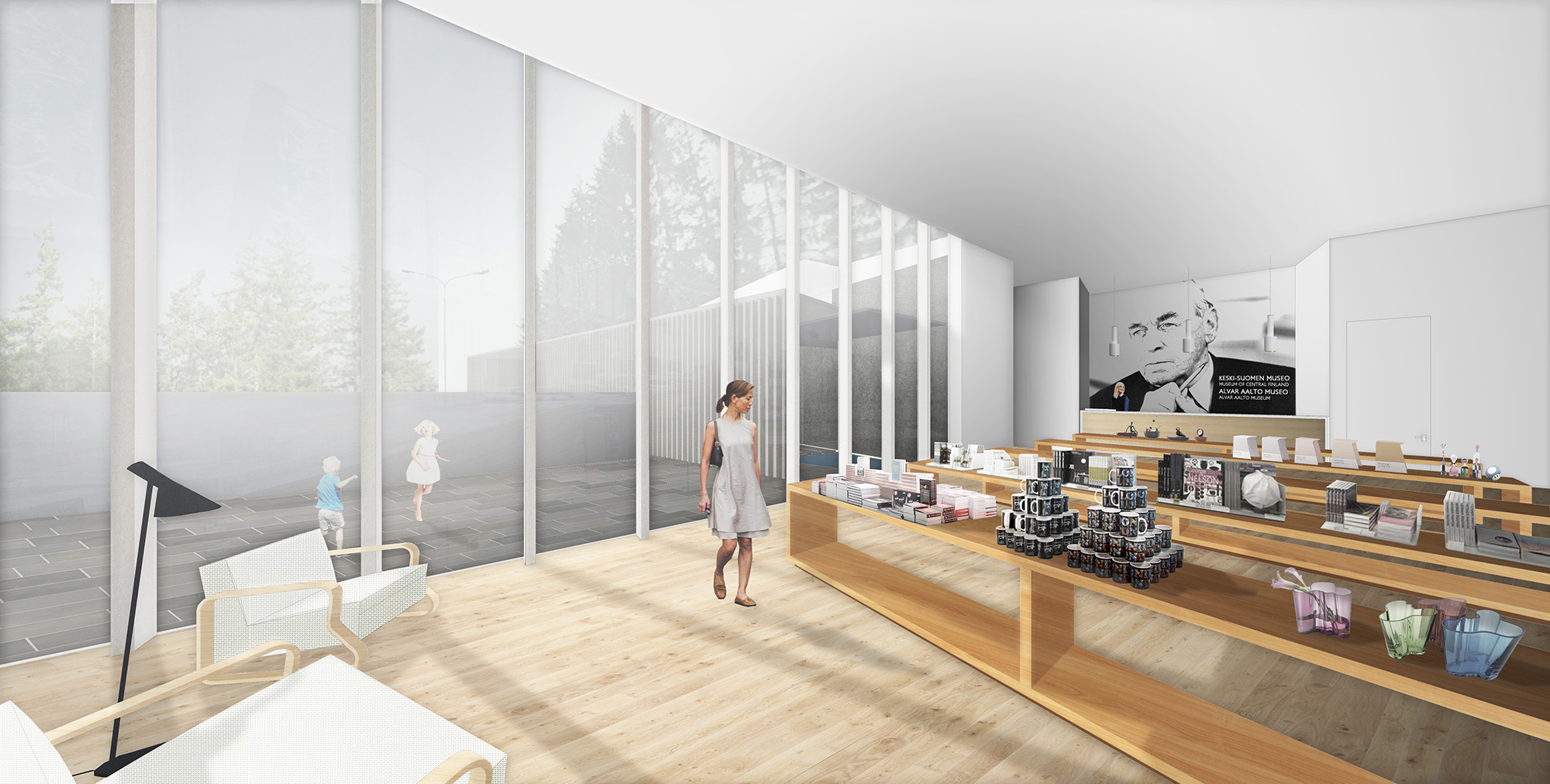 The experience of the new building begins underneath a canopy, running alongside a reflecting pool. The façade of the Alvar Aalto Museum is reflected in the tranquil waters of the pool. At the end, a small passage leads into the front garden, opened to the public at all times of the day and creating a communal space within the cradle of the three buildings. Stepping inside the new extension, a large picture window frames another pool at the rear of the building, reflecting the Finnish landscape in its water to create a moment of tranquility. By balancing the landscape, light and architecture together, the new extension pays tribute to the architecture of Alvar Aalto without resorting to direct imitation.