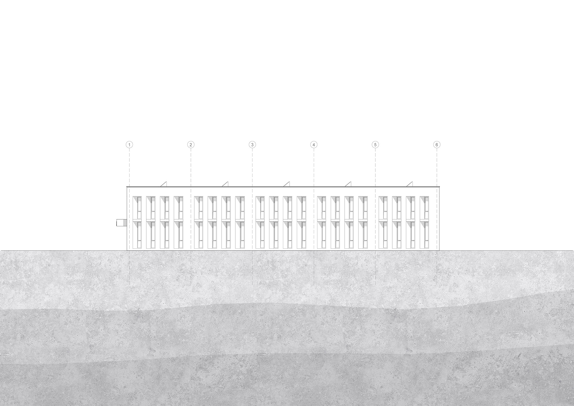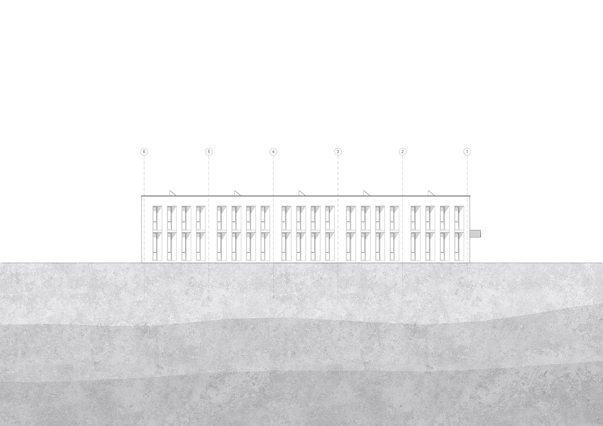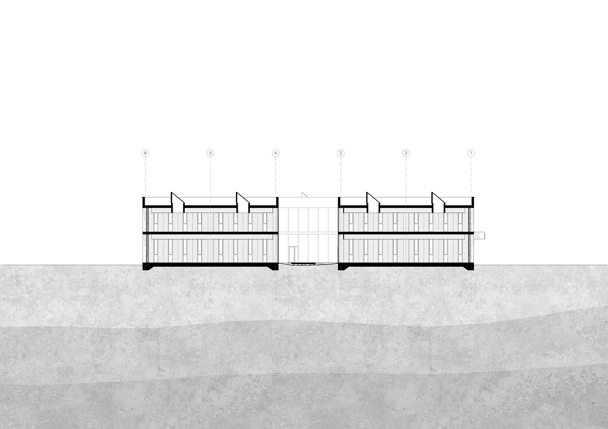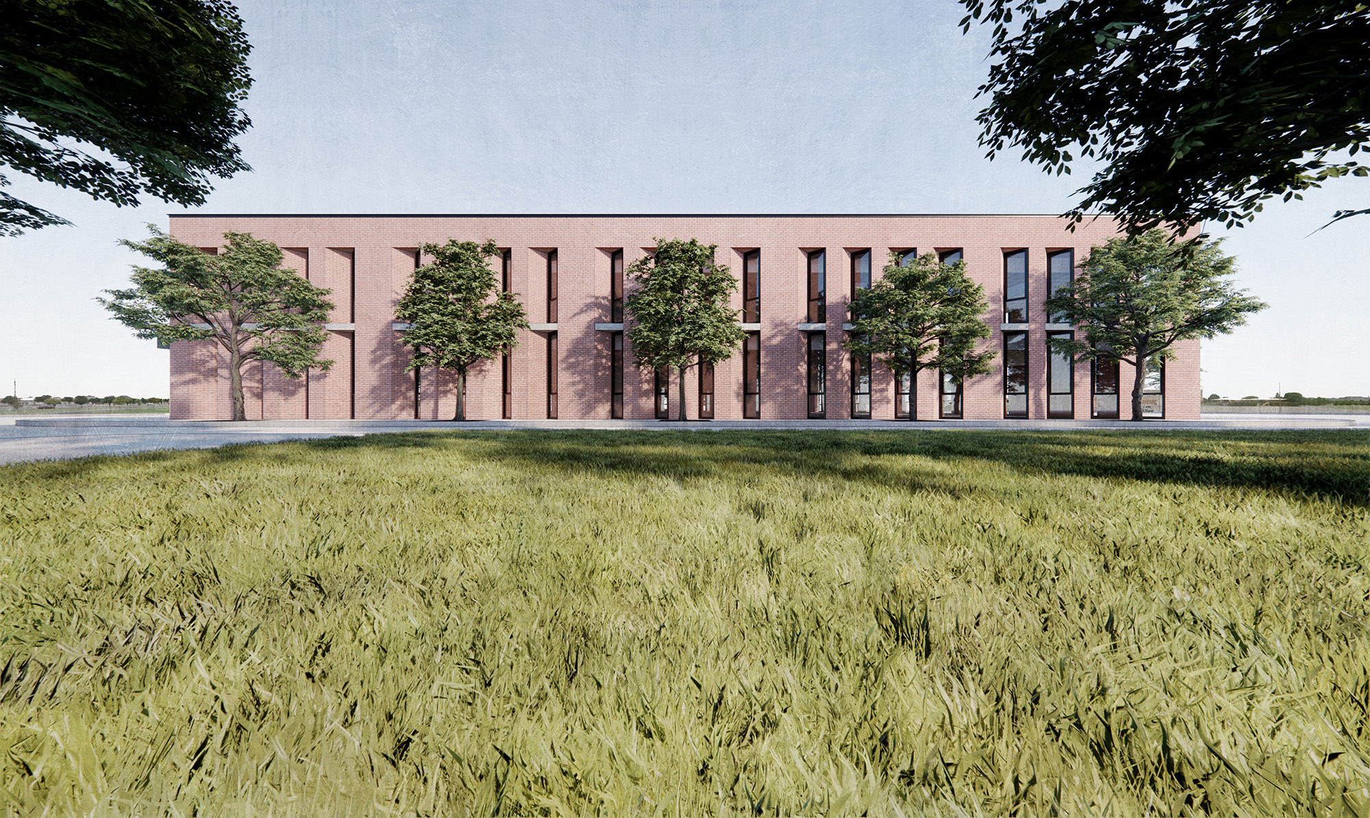 Using brick as the primary façade material, we studied the solar diagrams of Lubbock in order to maximize the daylight attainable while reducing the solar heat gain. Each elevation is thus designed according to the climatical requirements of the building. To the south, where the sun is highest in the sky and heat is a major concern, the windows are set within large recesses to shelter them from direct sunlight, while elevations to the east and west are mostly concerned with sunlight from low in the horizon, so windows are tilted away from the south to reduce direct penetration while still allowing for indirect sunlight.