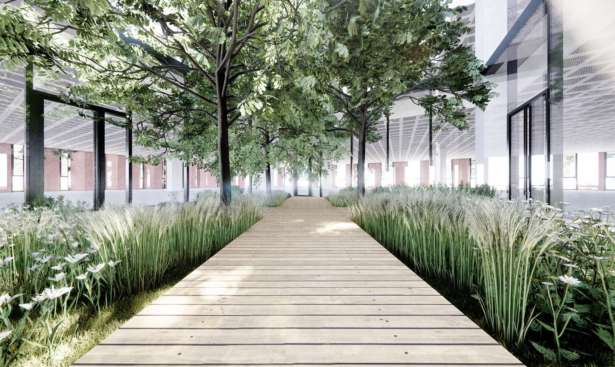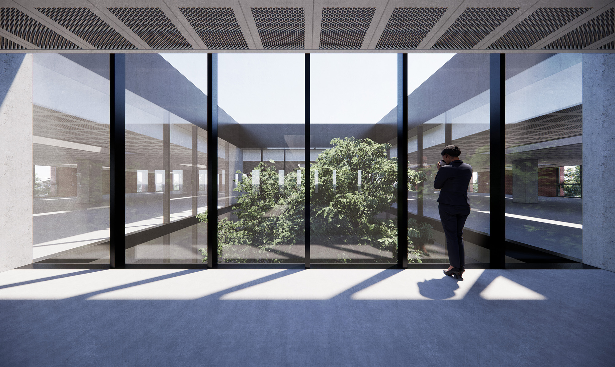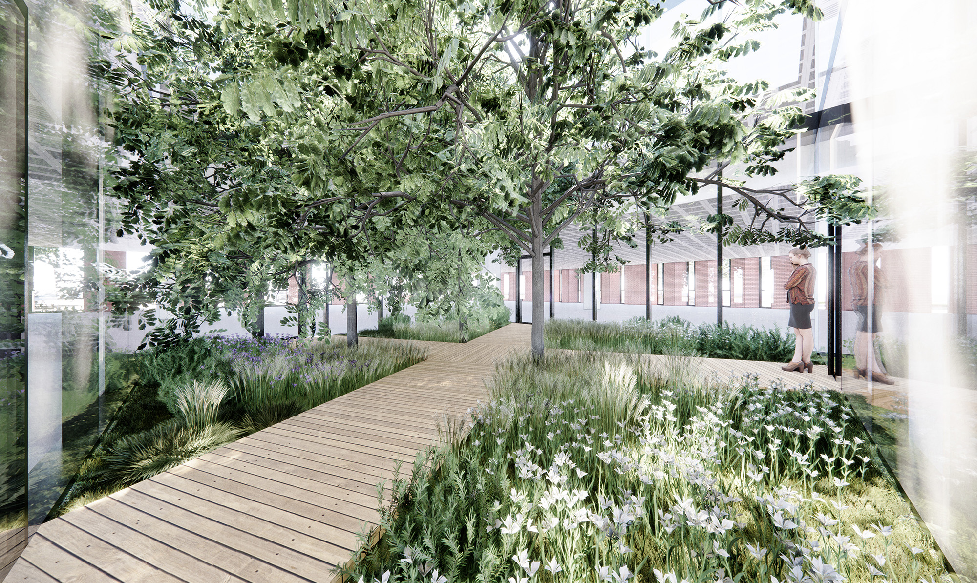 In order to bring light into the depths of the building, a courtyard is introduced in the centre of the building. This double volume allows daylight to flood the internal spaces so that no place in the office is more than 10m away from a window. The garden also allows staff to step out from the office, connecting the building with the outdoors.