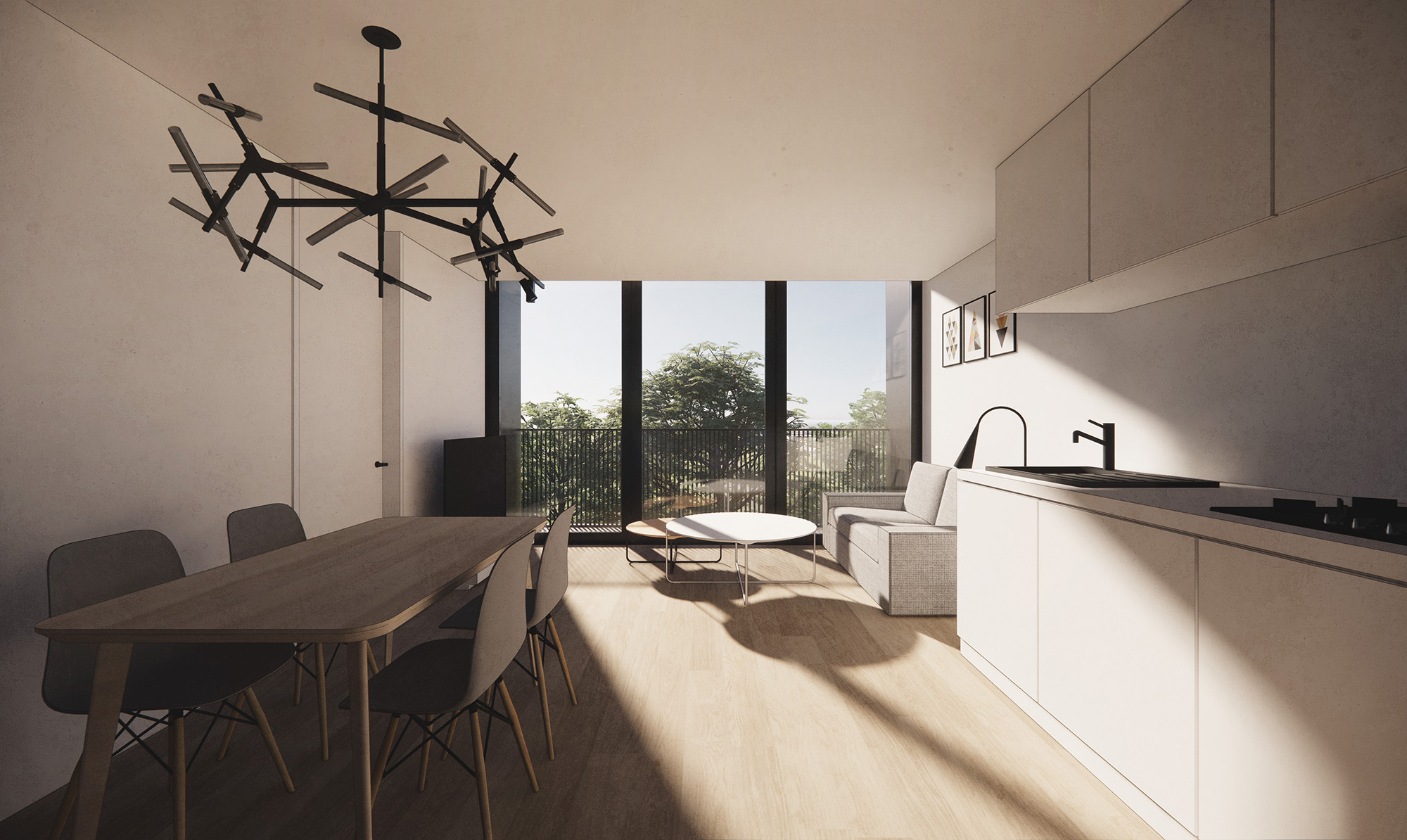 Modular construction is proposed and adopted in the design. Units are made of a living and sleeping module, and designed to fit two apartments and the common corridor in the middle within one module.