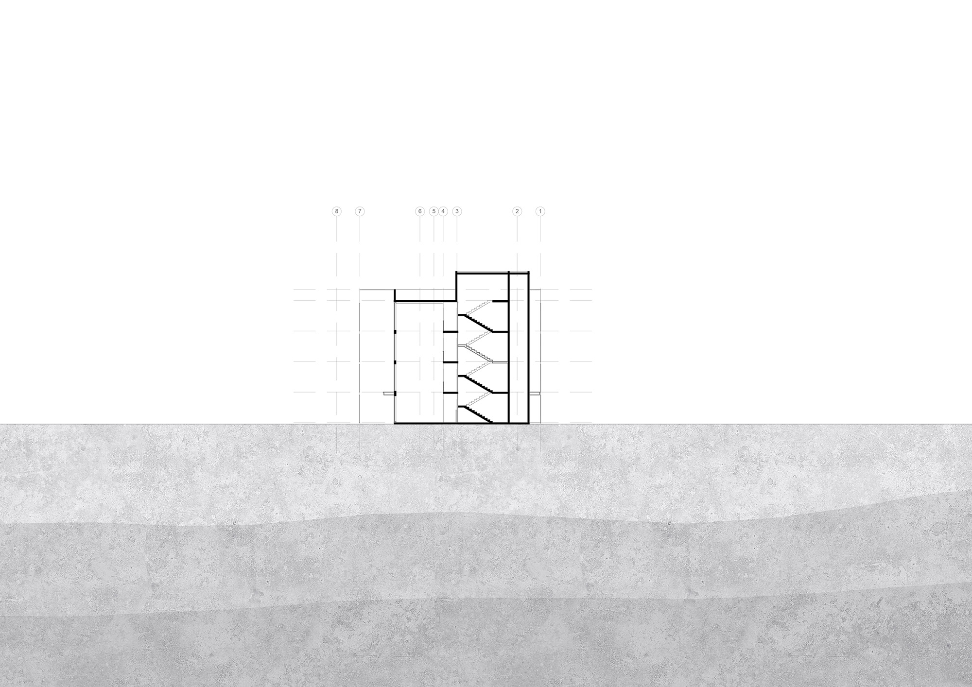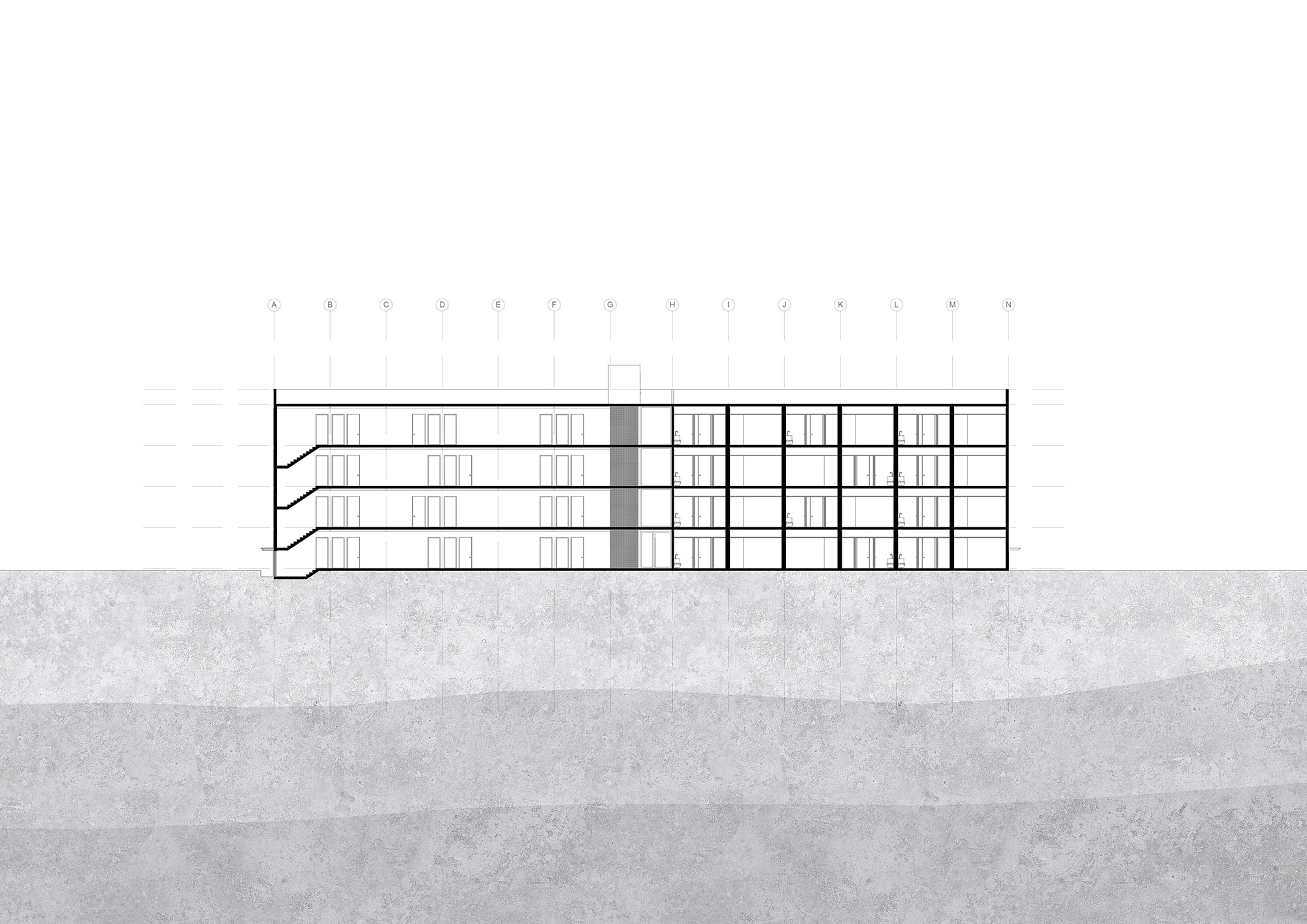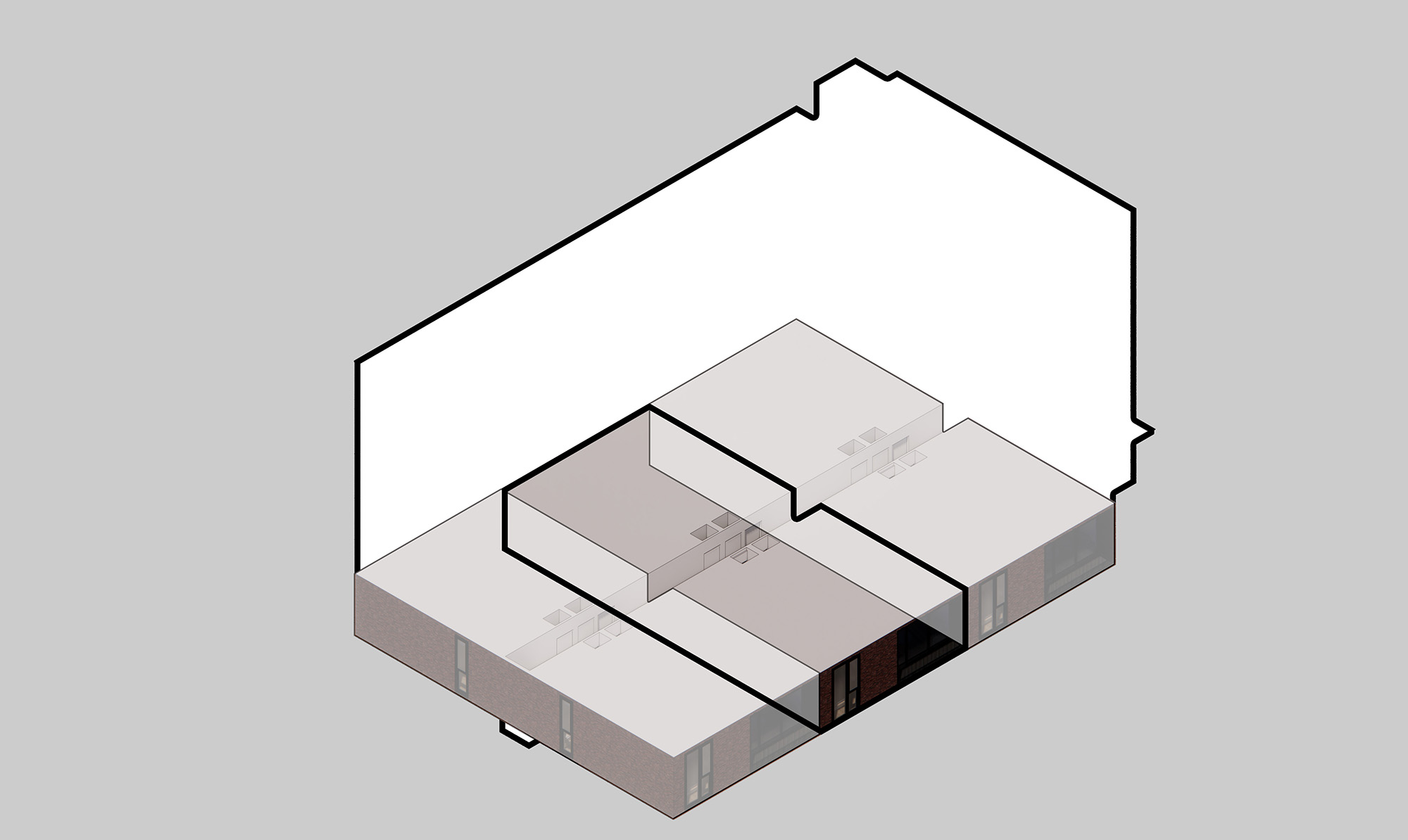 Taking advantage of the trees on the existing site, the building becomes hidden from the street. Carefully designed to align with the tree tops when viewed from the street, the building mass becomes integrated into the site.