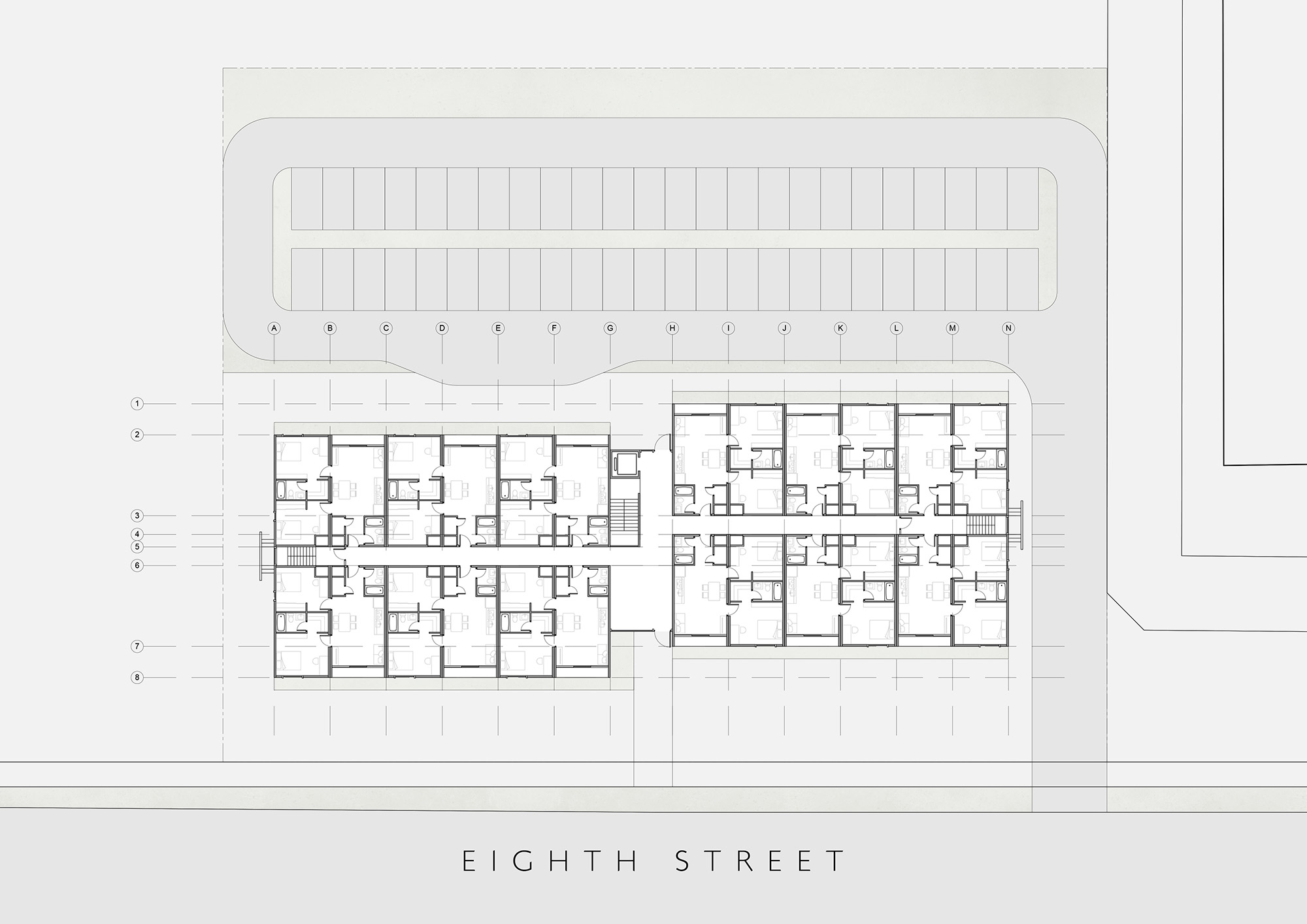 On this stretch of Eighth Street, we proposed a 4 storey building that would be home to 48 units of 2-bedroom apartments. Designed to be constructed in two phases, the building could potentially overwhelm the street’s character with its massing.