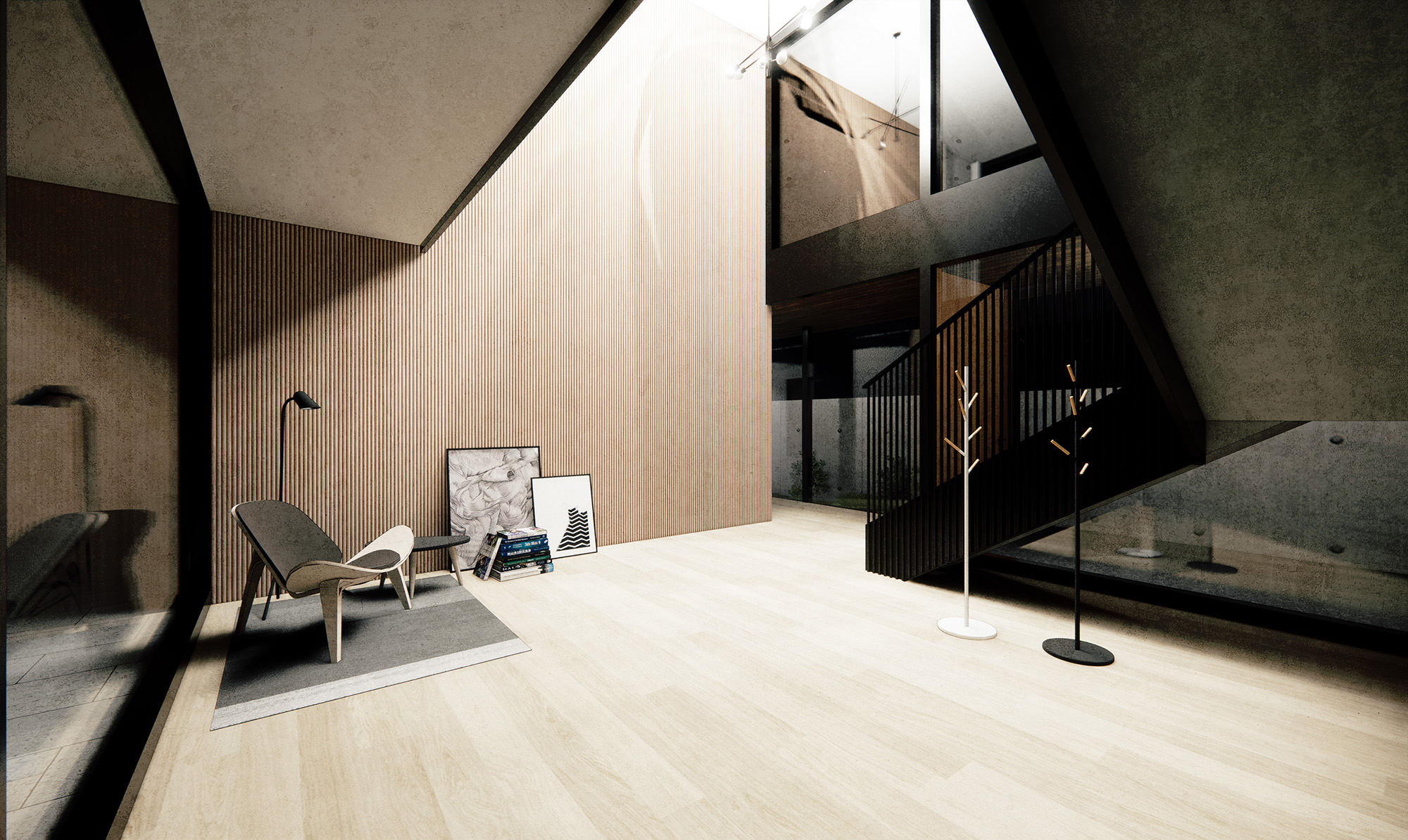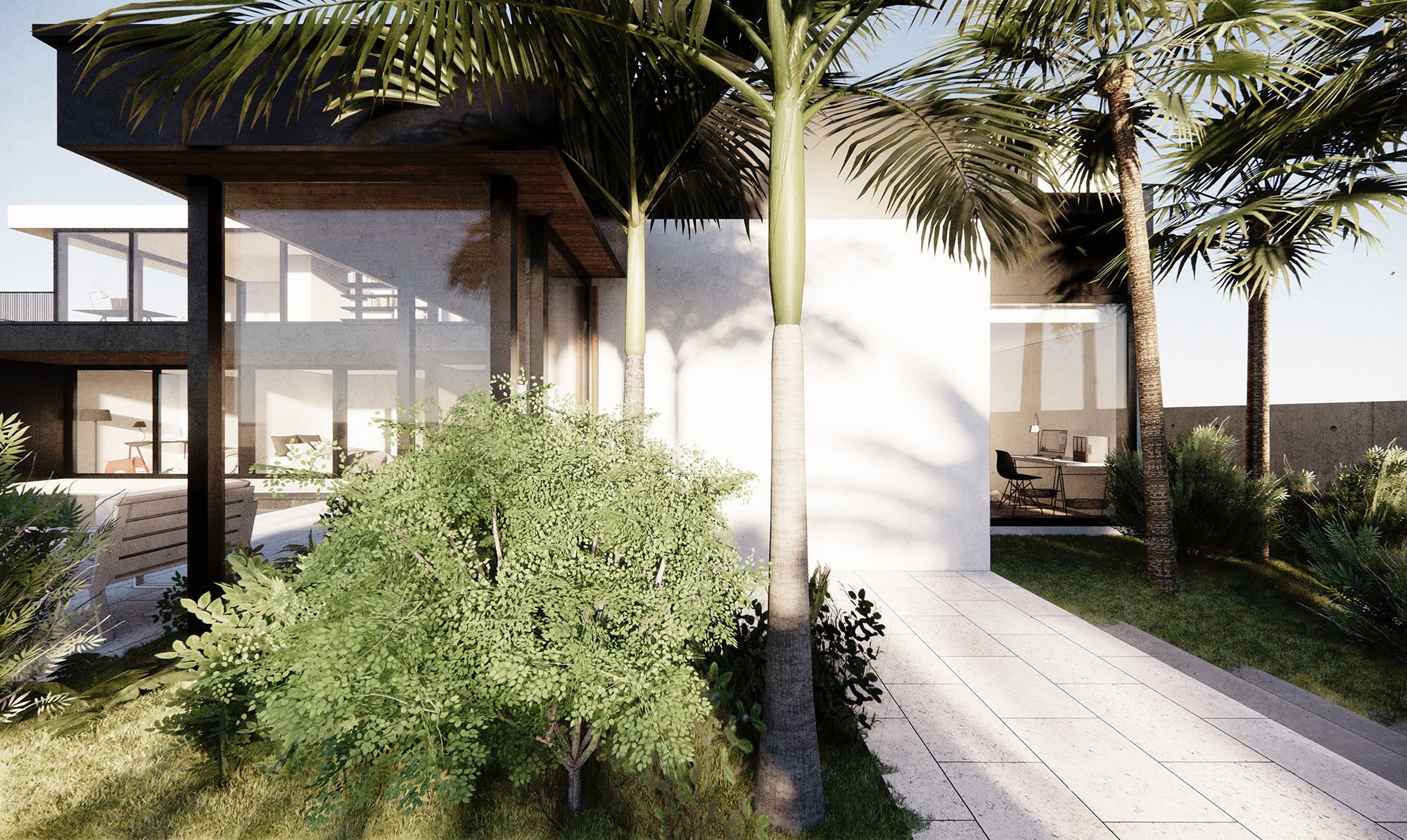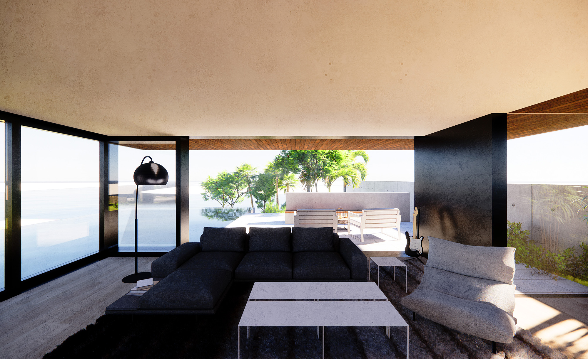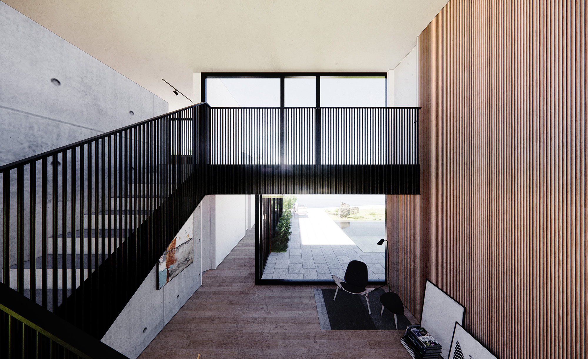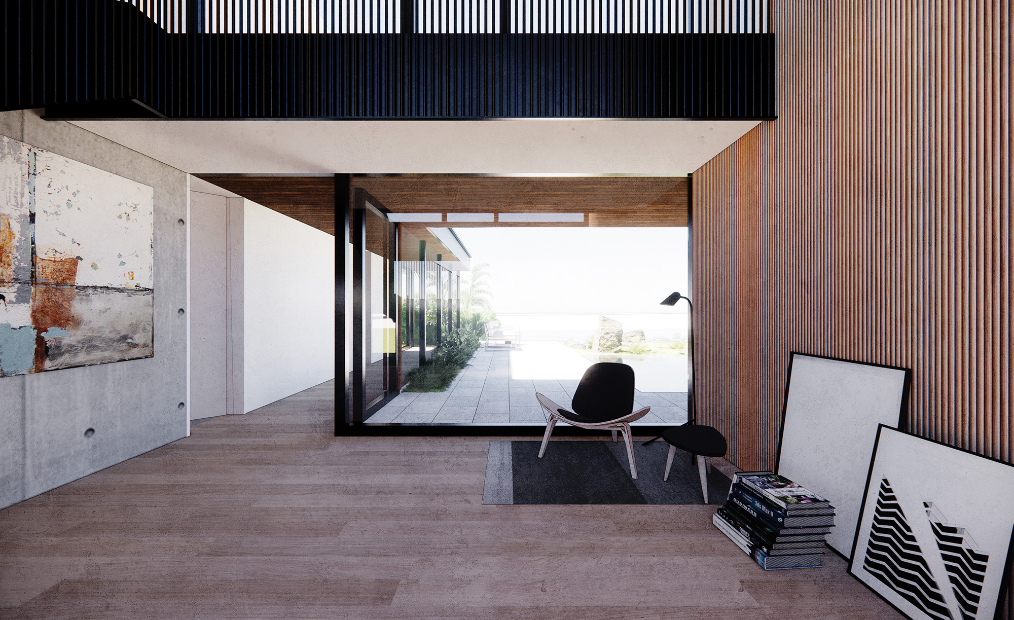 The house is designed around a double storey foyer which acts as the central element of the design. Greeting the inhabitants with a picture window which faces towards the ocean, the foyer pivots around the swimming pool to tie the two elements together.