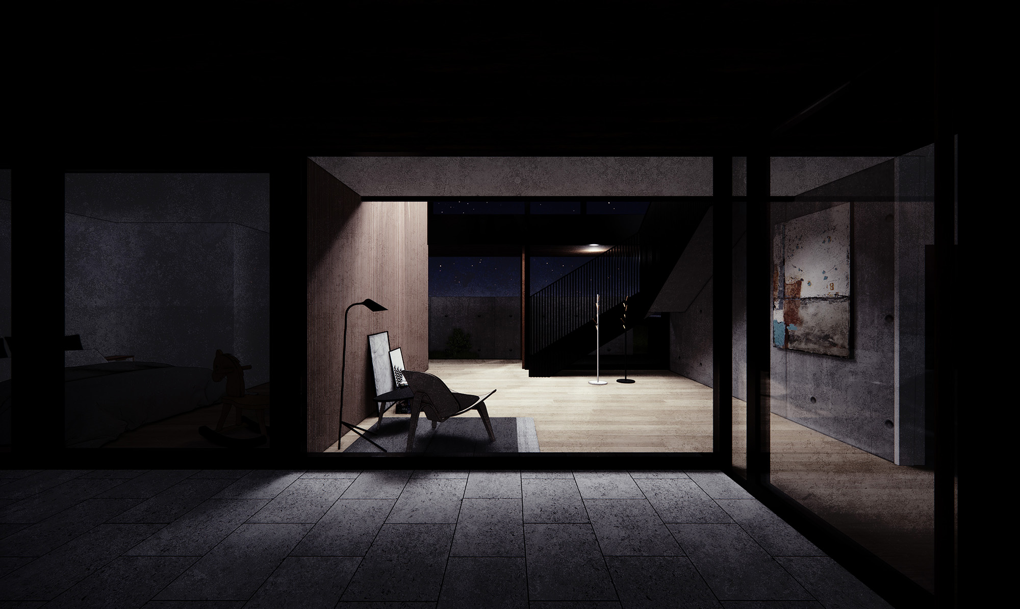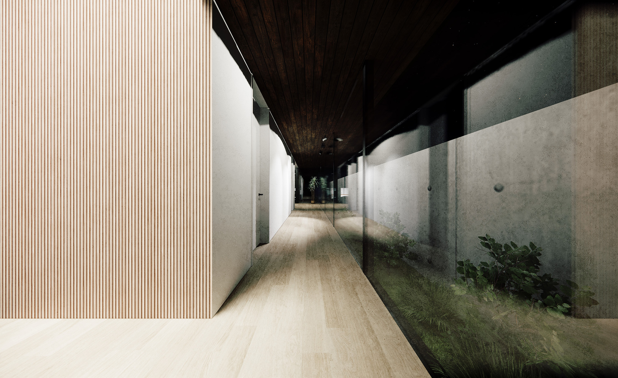 Glass enclosed walkways lead from the foyer towards the two sides of the house. Designed as a gallery like space with the landscape garden as the artistic exhibit, the walkways bring in nature while moving around the house.