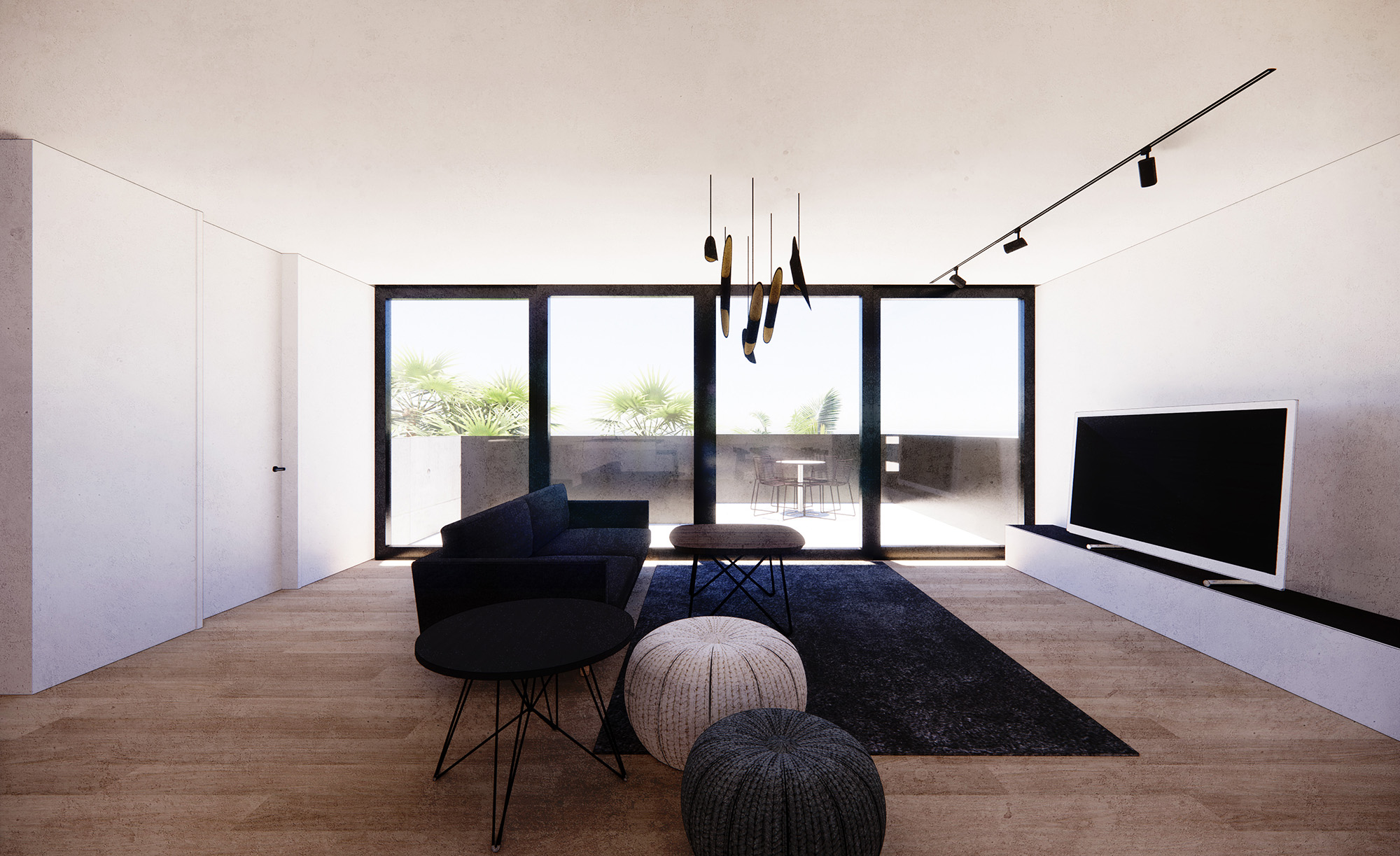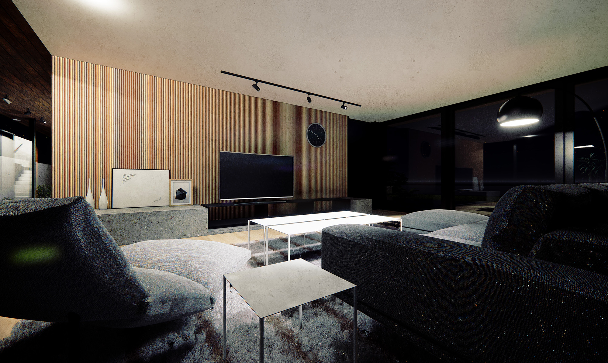 Conceived of as the activity centre of the house, the game room at the end of the walkway features sliding doors which open to both the outdoor garden as well as the swimming pool. This room takes full advantage of the warm Australian weather to bring the garden in as part of the house.