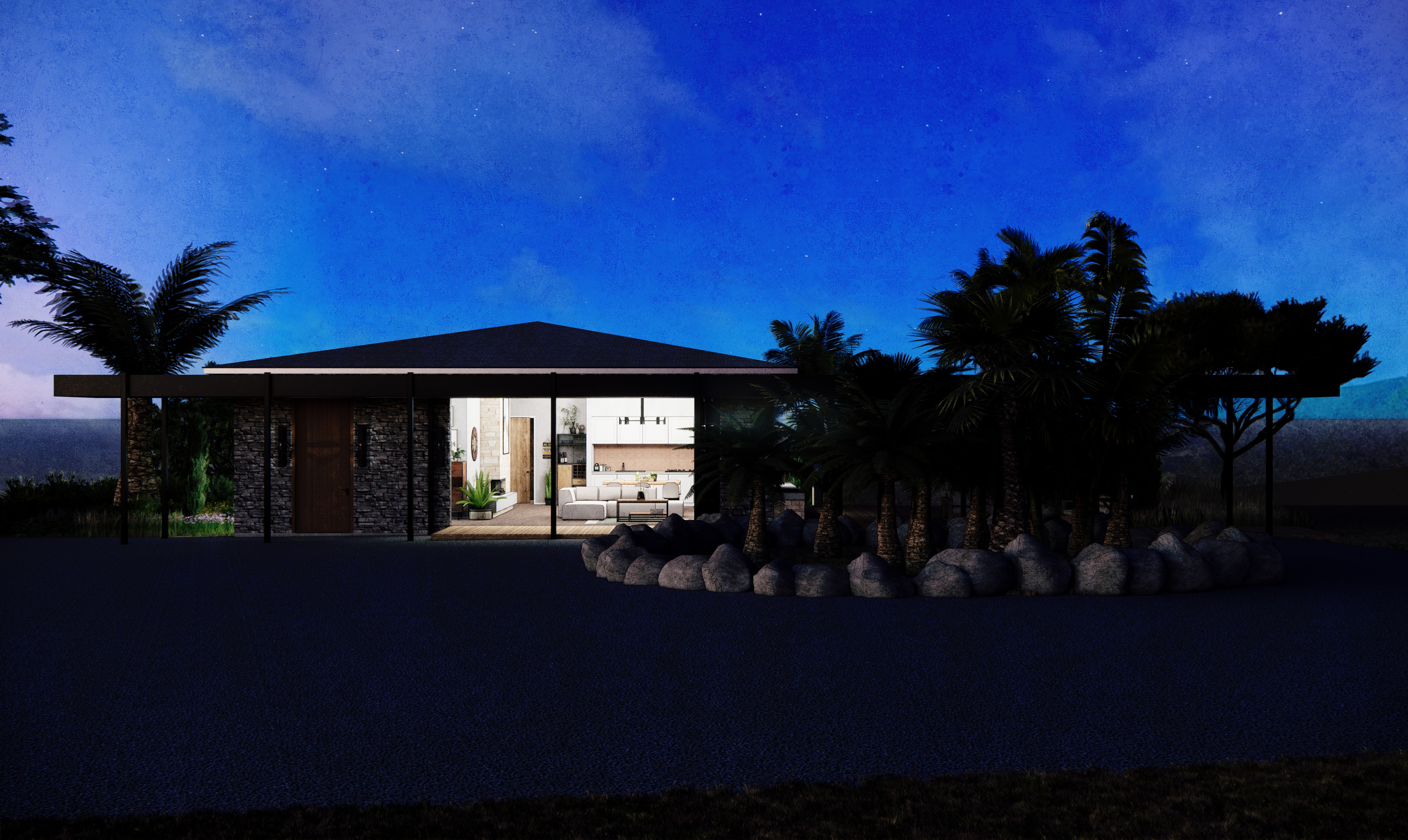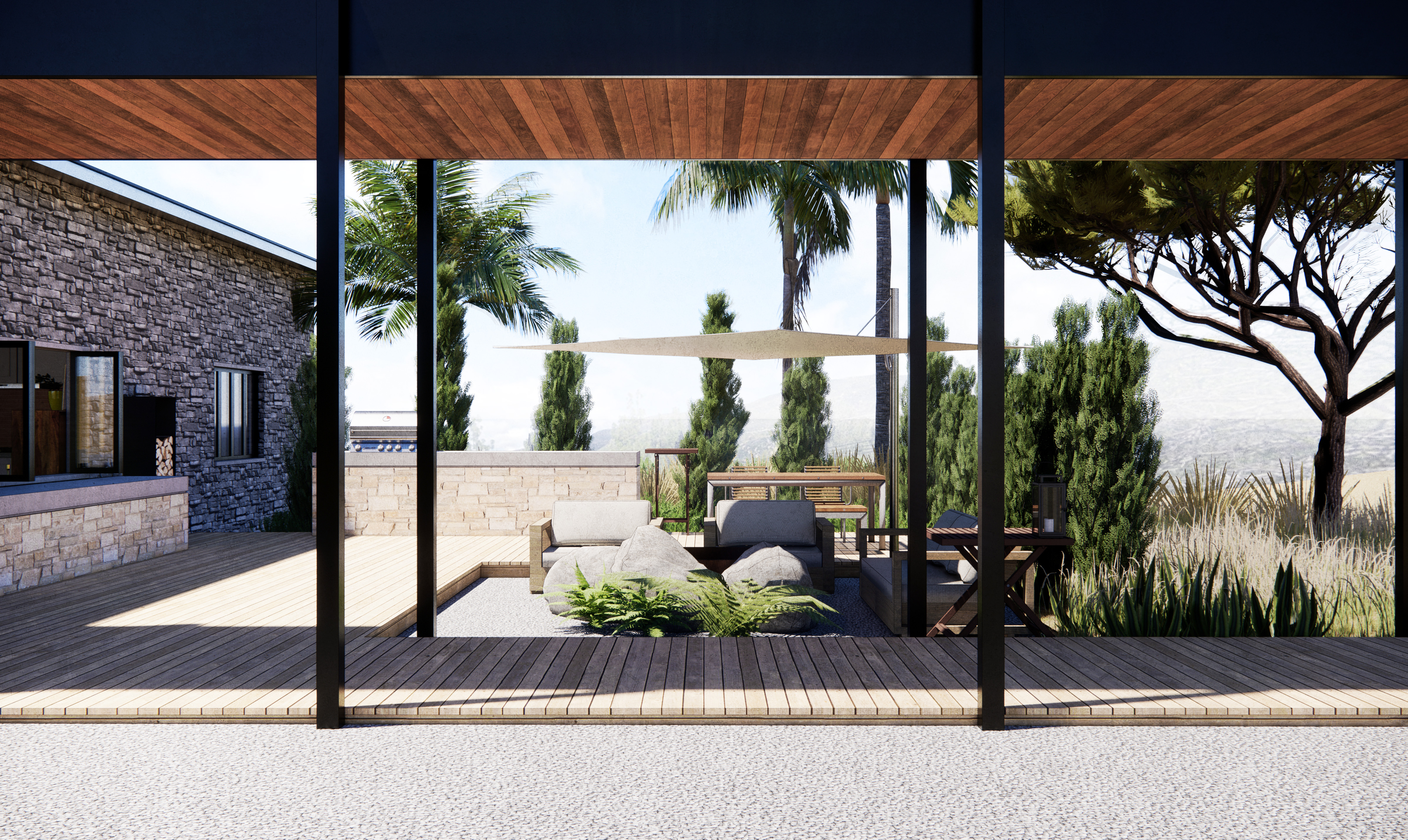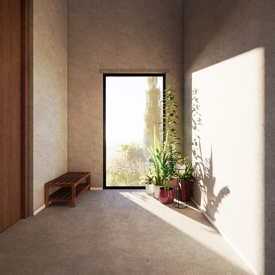 Inside, the space is designed around an open plan living area. Entry to the house is through a vestibule which overlooks onto a landscaped garden like a painting of the landscape. Bedrooms lead off the main space, offering views of the surrounding garden.