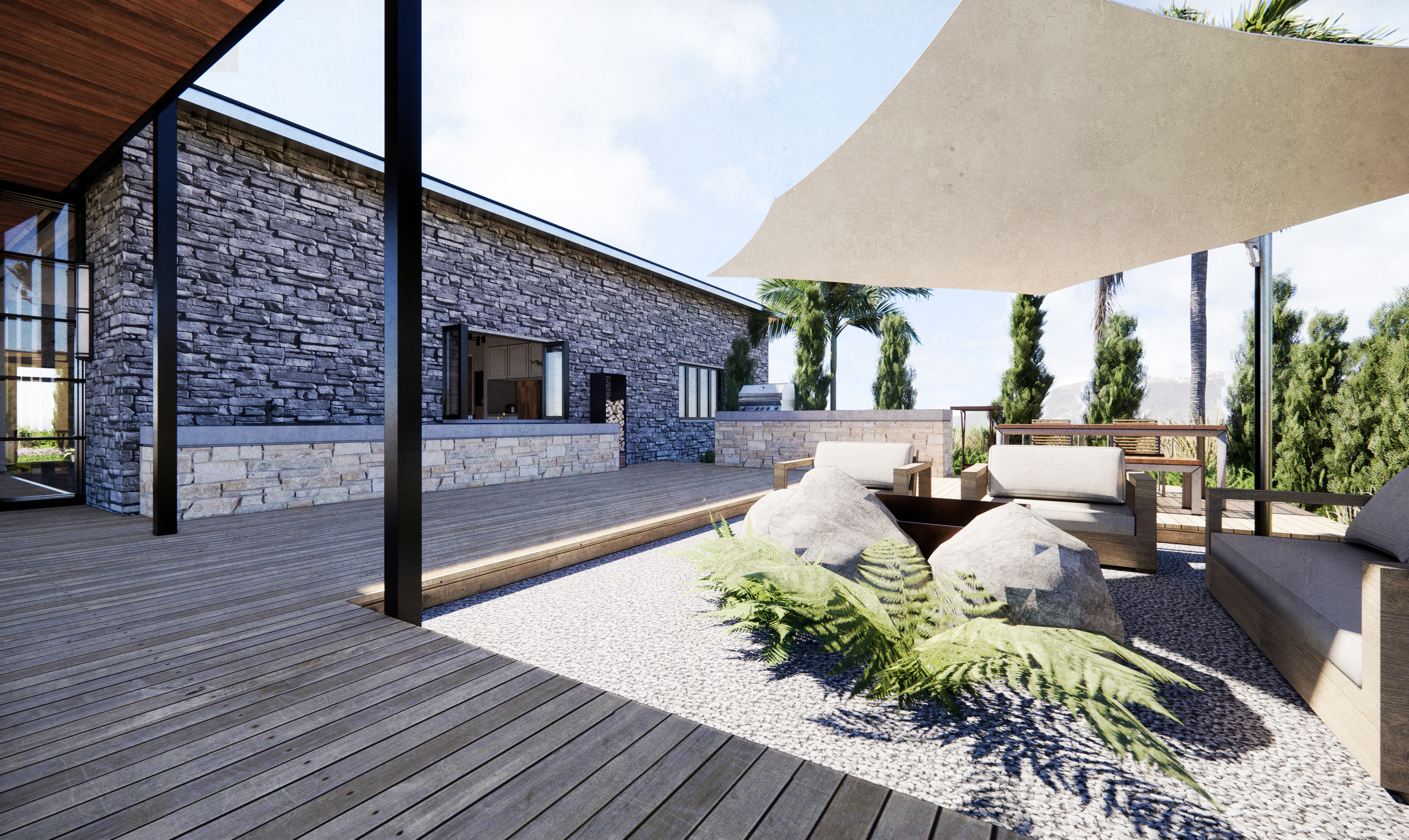 Using the wide open façade of the existing garage door, the elevation is designed with foldable glass doors which connect the living space with the outside garden. To control the harsh south-facing sun, a new canopy extends the length of the façade, connecting with a new outdoor garden.