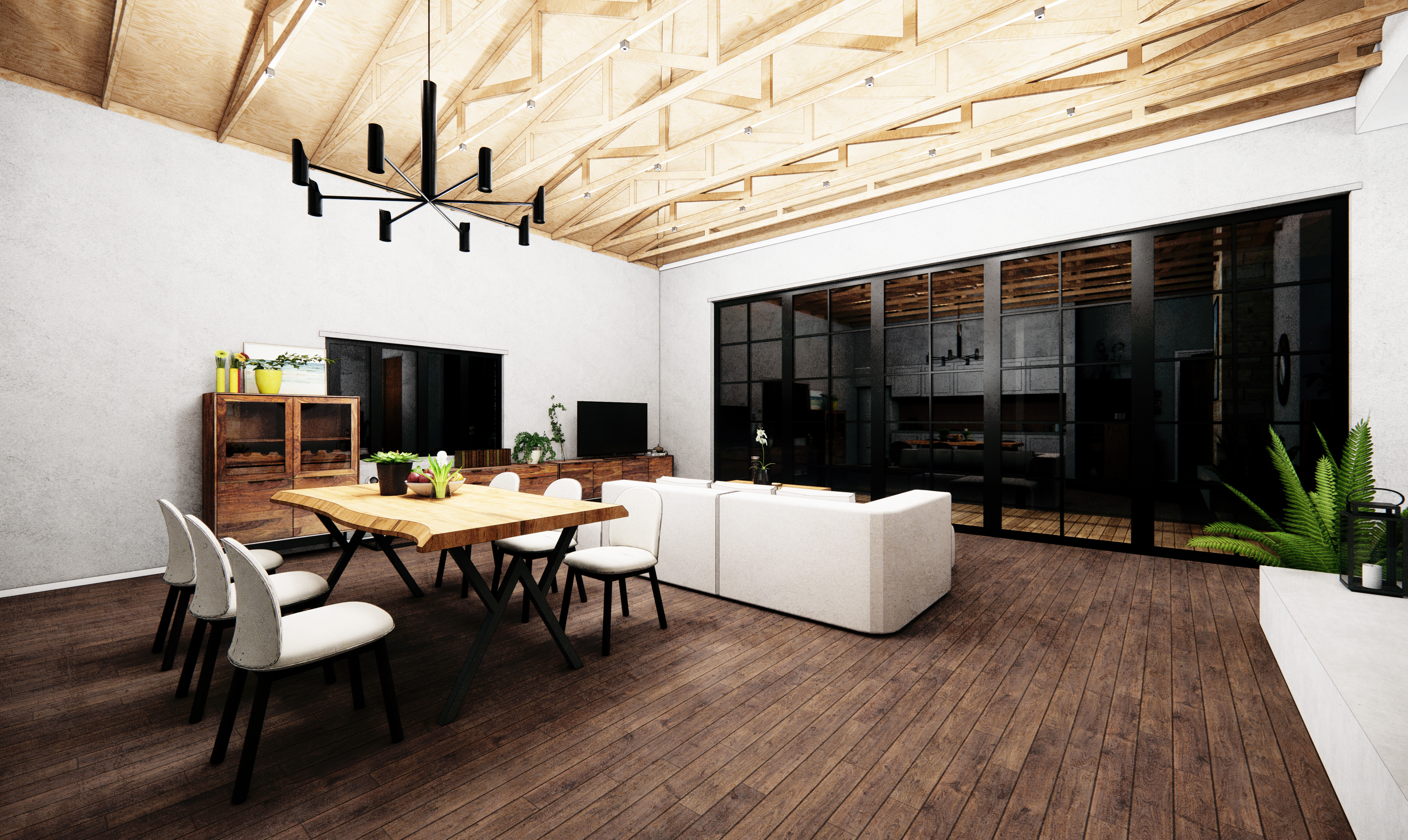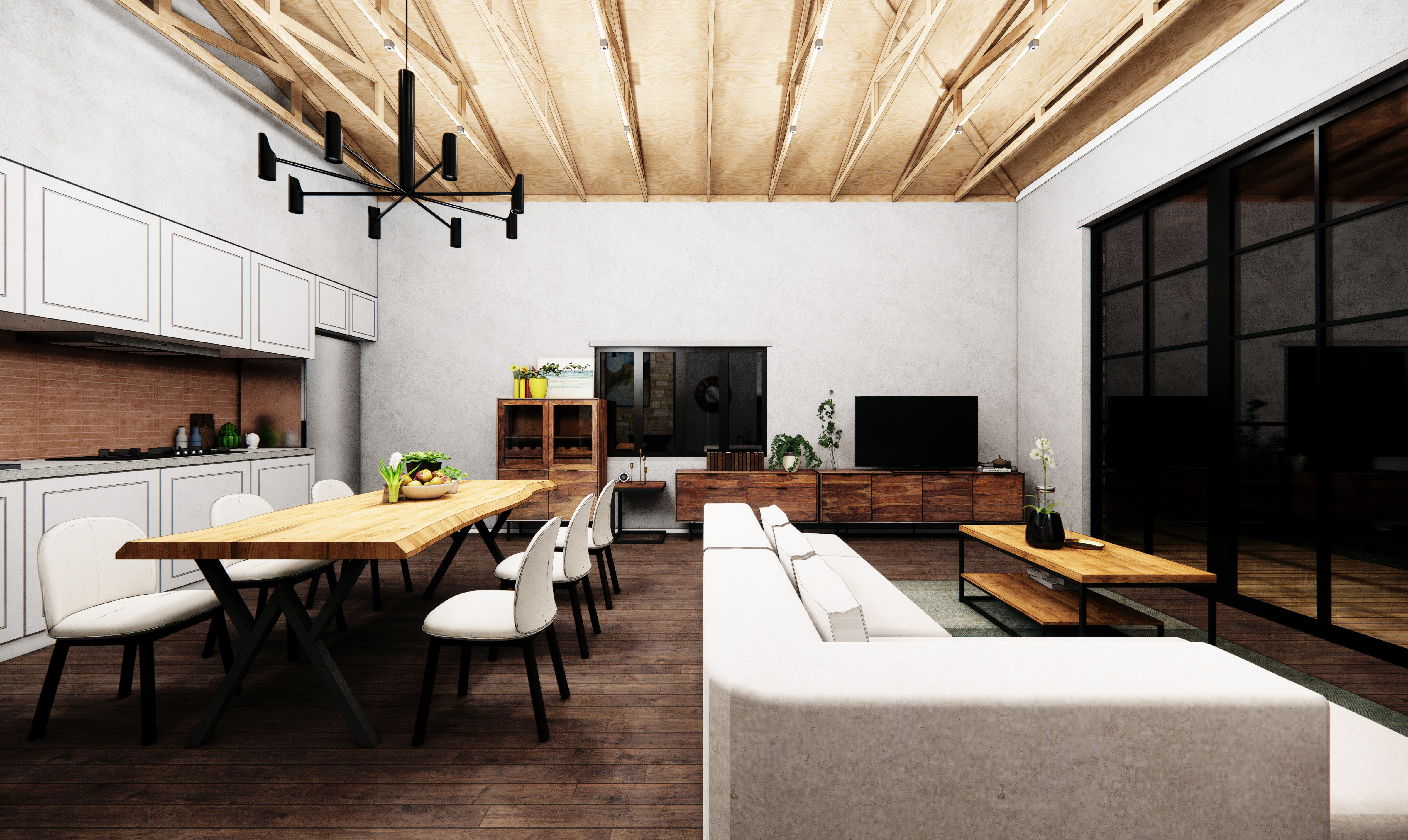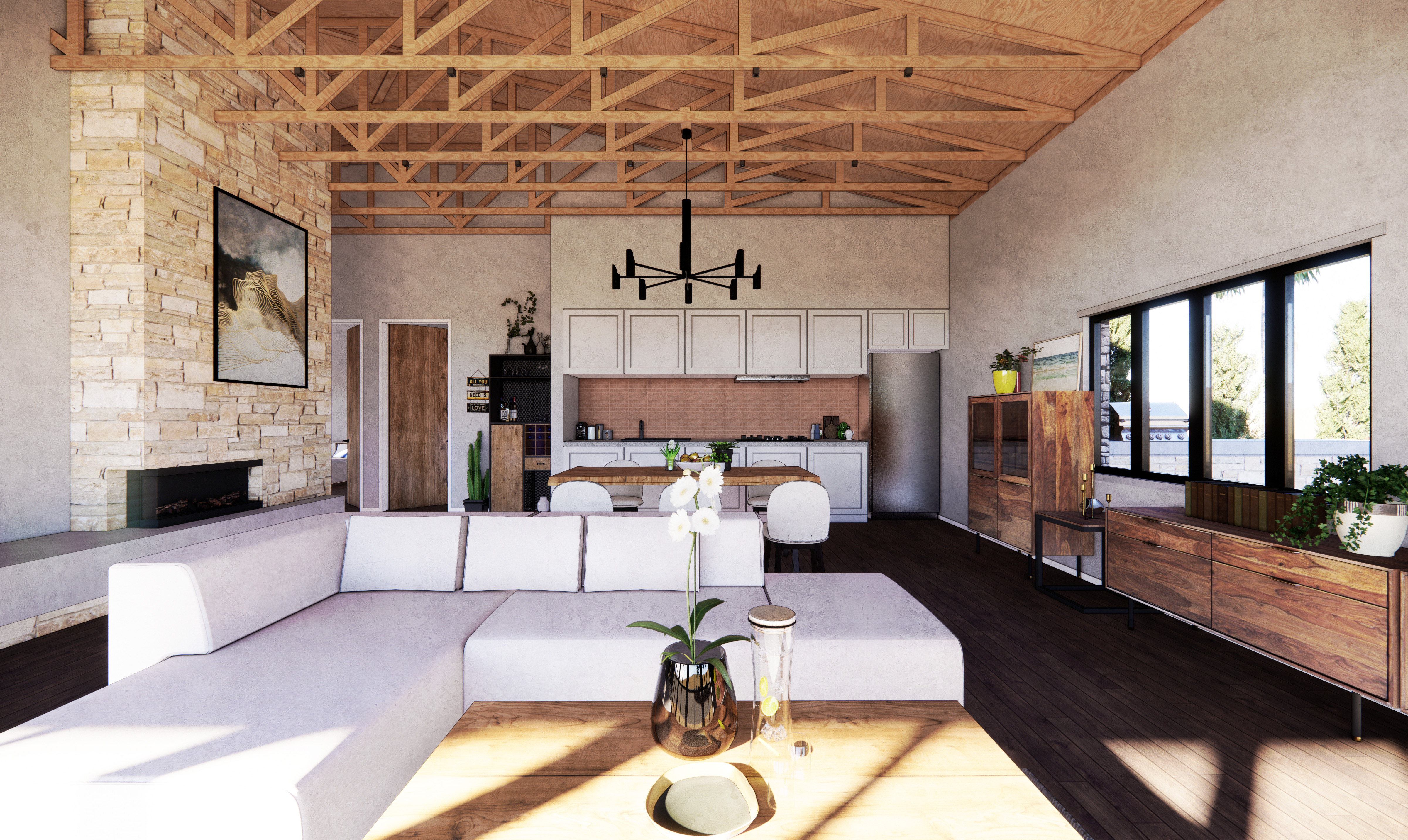 The existing open truss ceiling is left exposed as a defining feature of the ceiling, which also adds to the rustic charm and aesthetics of the design.
