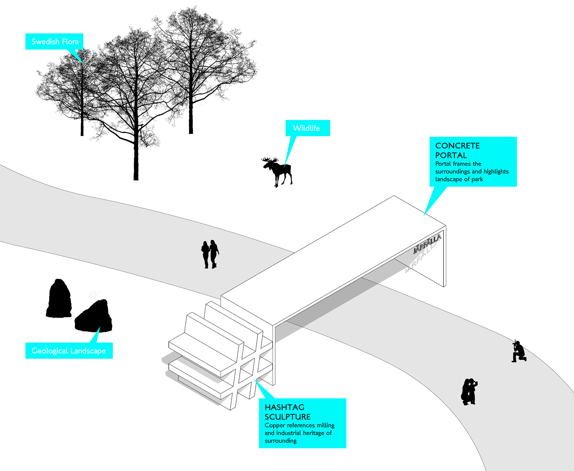 Hashtag Järfälla proposes a design that reminds people of their place within the urban landscape through a dialogue with social media. By framing the landscape through the form of a hashtag, the design reconnects people with the city.