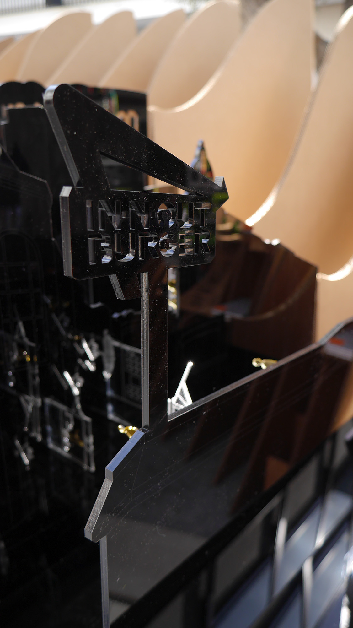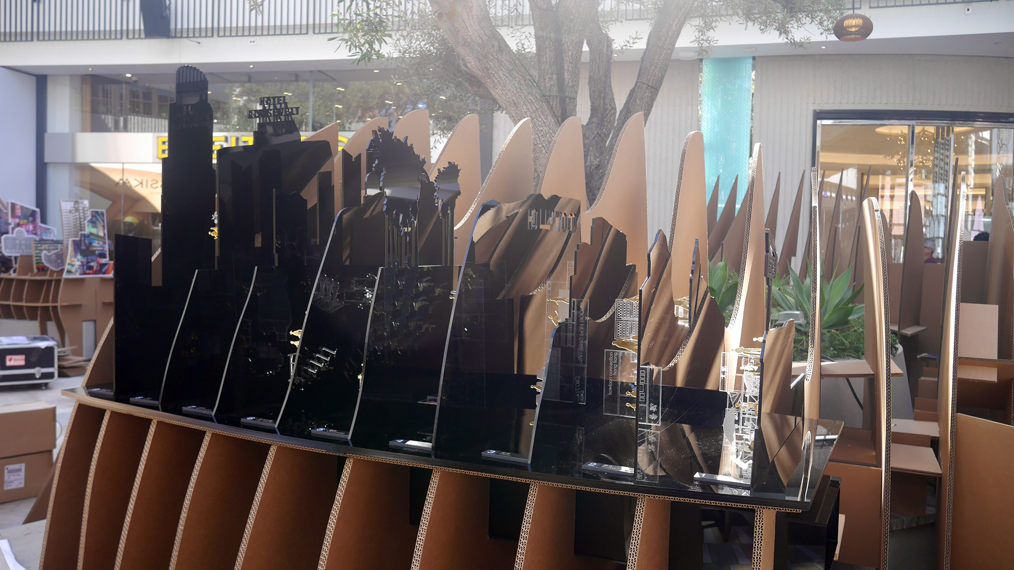 Our proposal for the “Island__Peninsula” Exhibition aims to showcase the polarity of these two cities with one single model. From one perspective, the skyline of Los Angeles rises, formed by different building plates overlapping in front of each other. This reflects the overall form of the city, with each programme separated into a different city block.