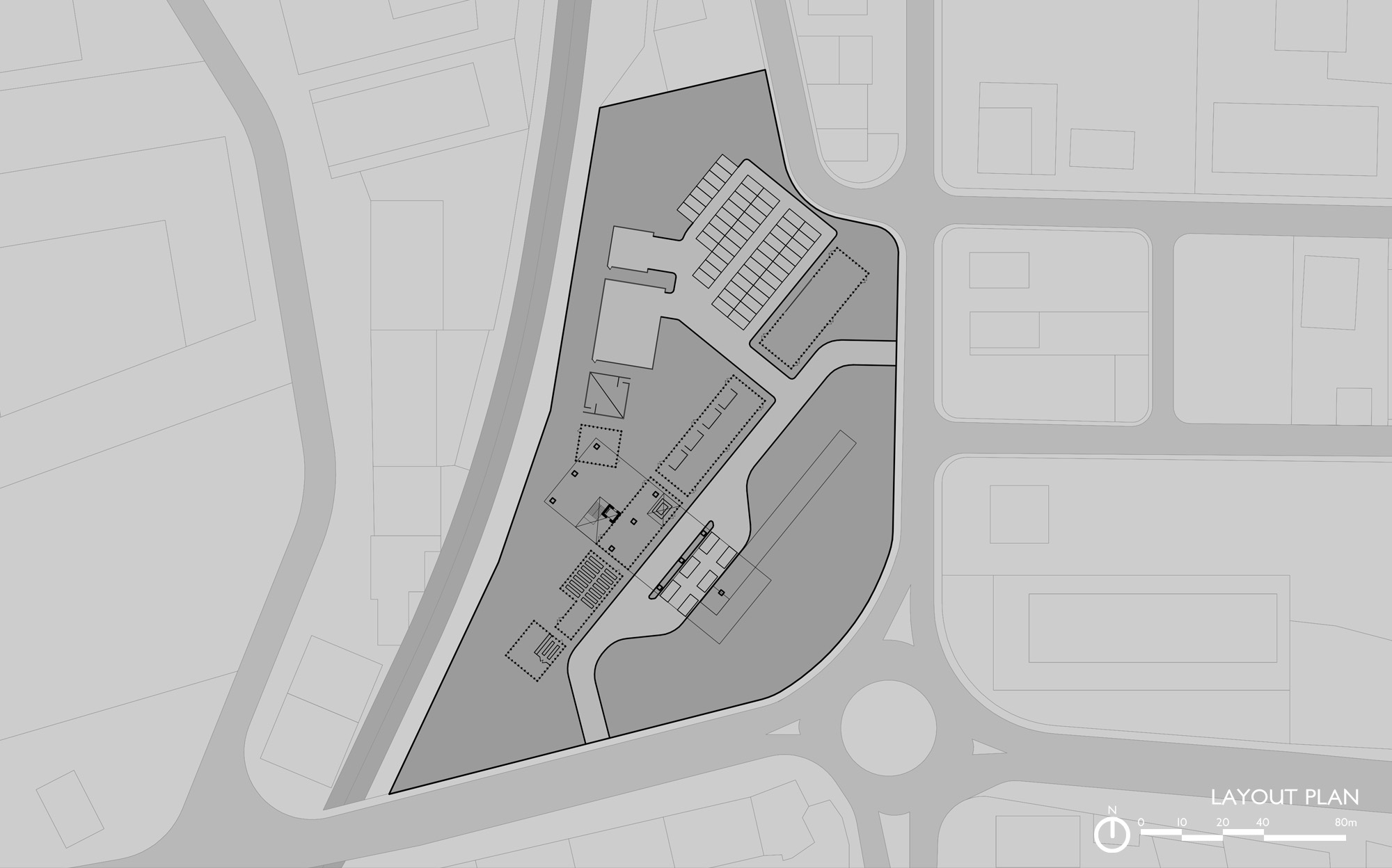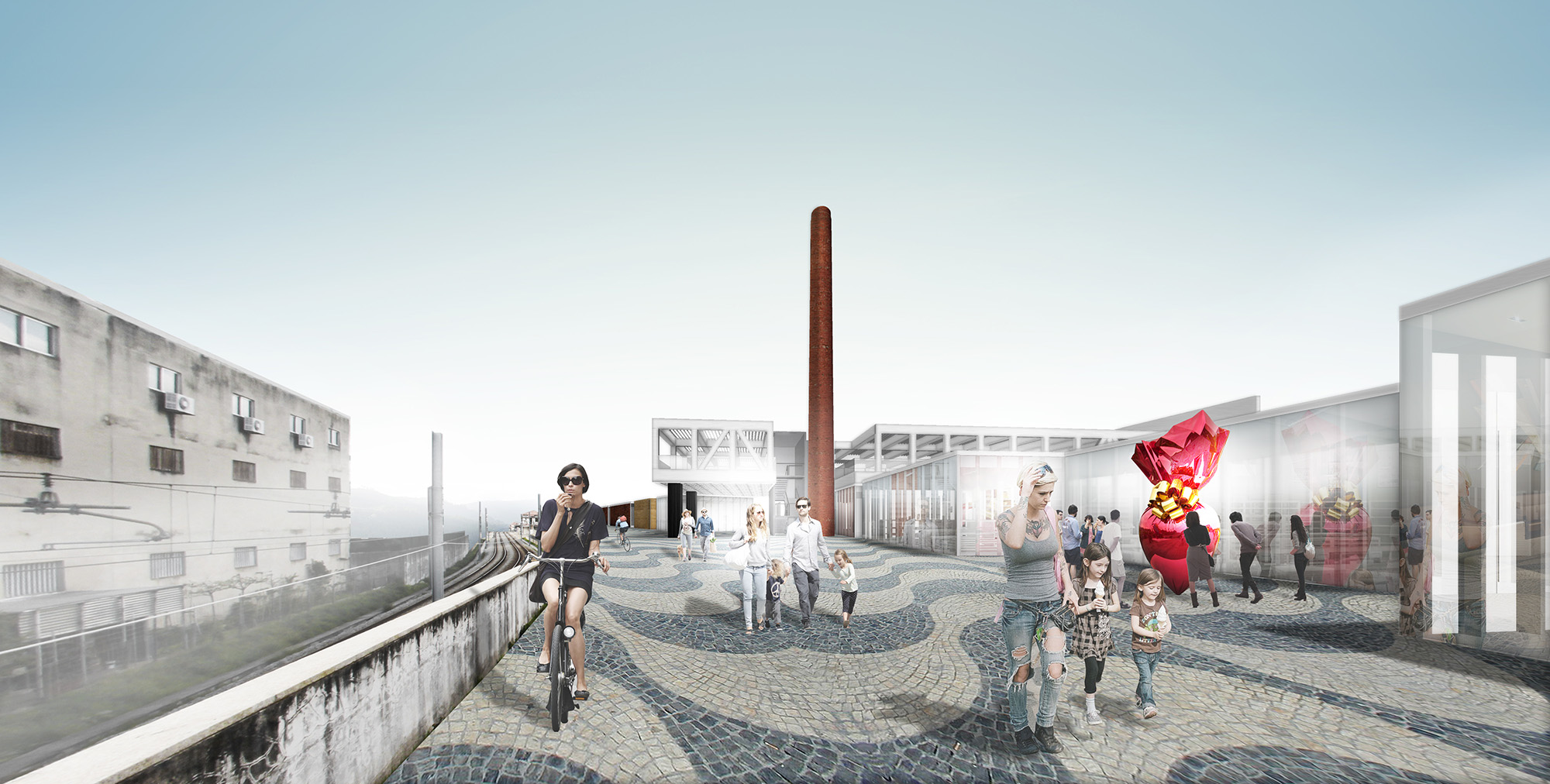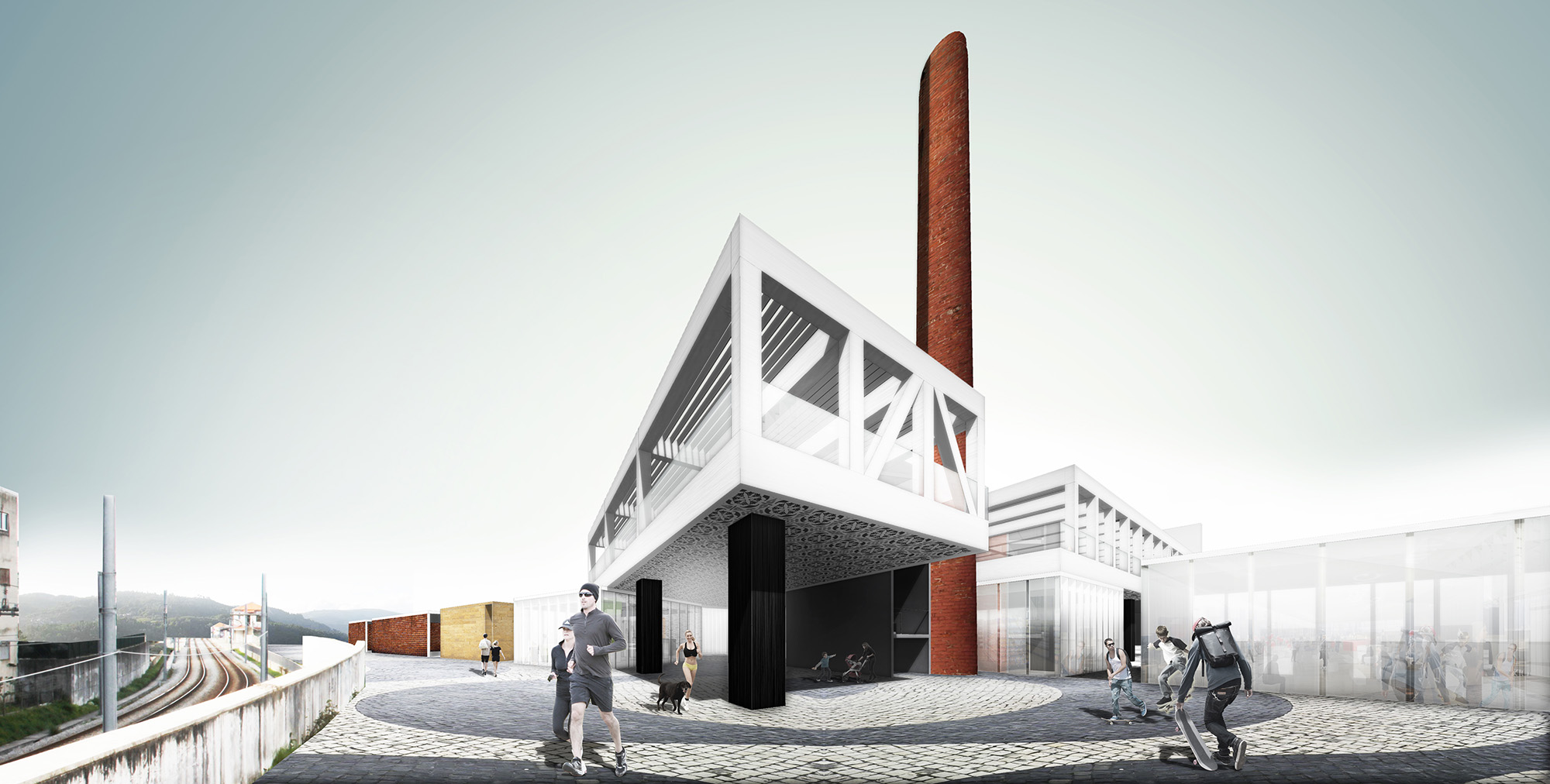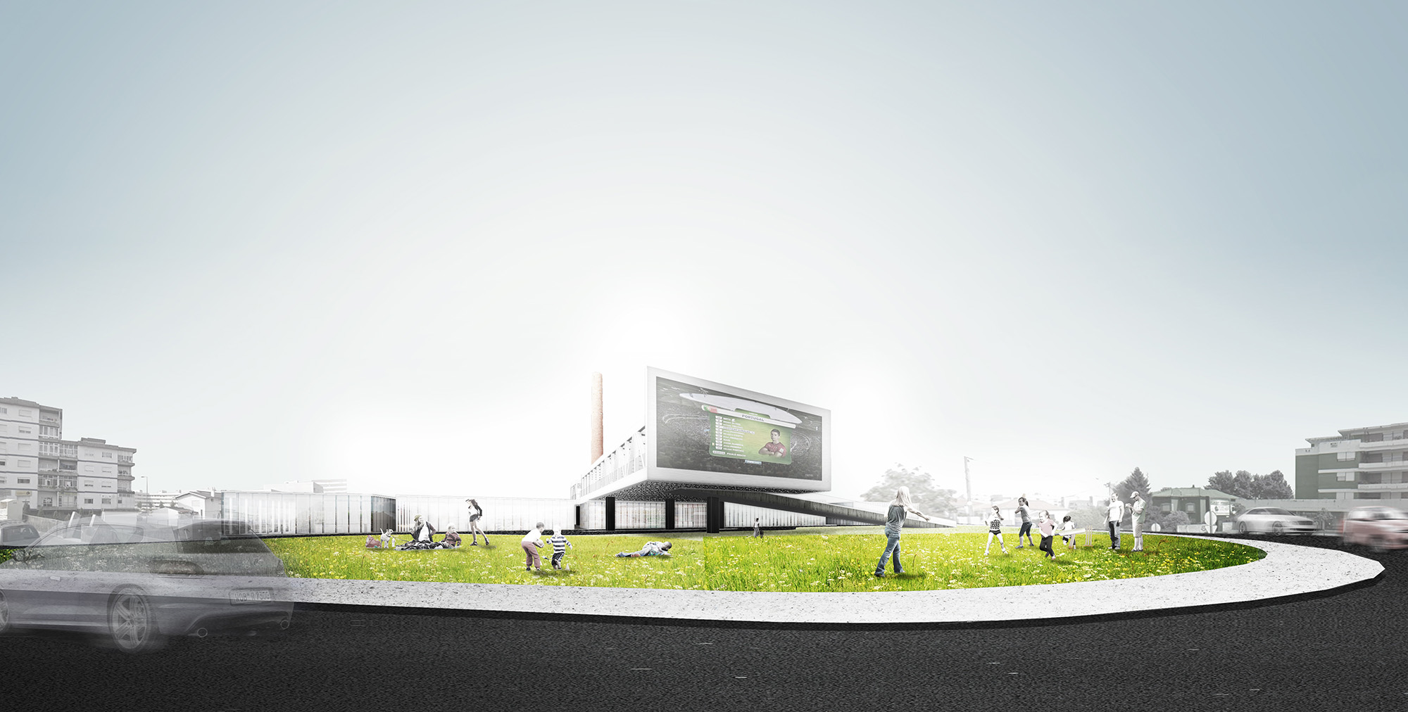 The building lies along a linear, diagonal axis, connecting two intersections in the surrounding while dividing the site into three distinctive spaces. An esplanade, running parallel to Line C of the Porto Metro, is faced with pedestrian accessible programmes such as restaurants, shops and other facilities. An intermediate space becomes a public square, where public performances converge outside an artist studio and exhibition galleries. Finally, a large landscape opens onto the nearby roundabout, where its relationship with the media screen means it could be interpreted as an outdoor cinema or spectator stand for football matches.