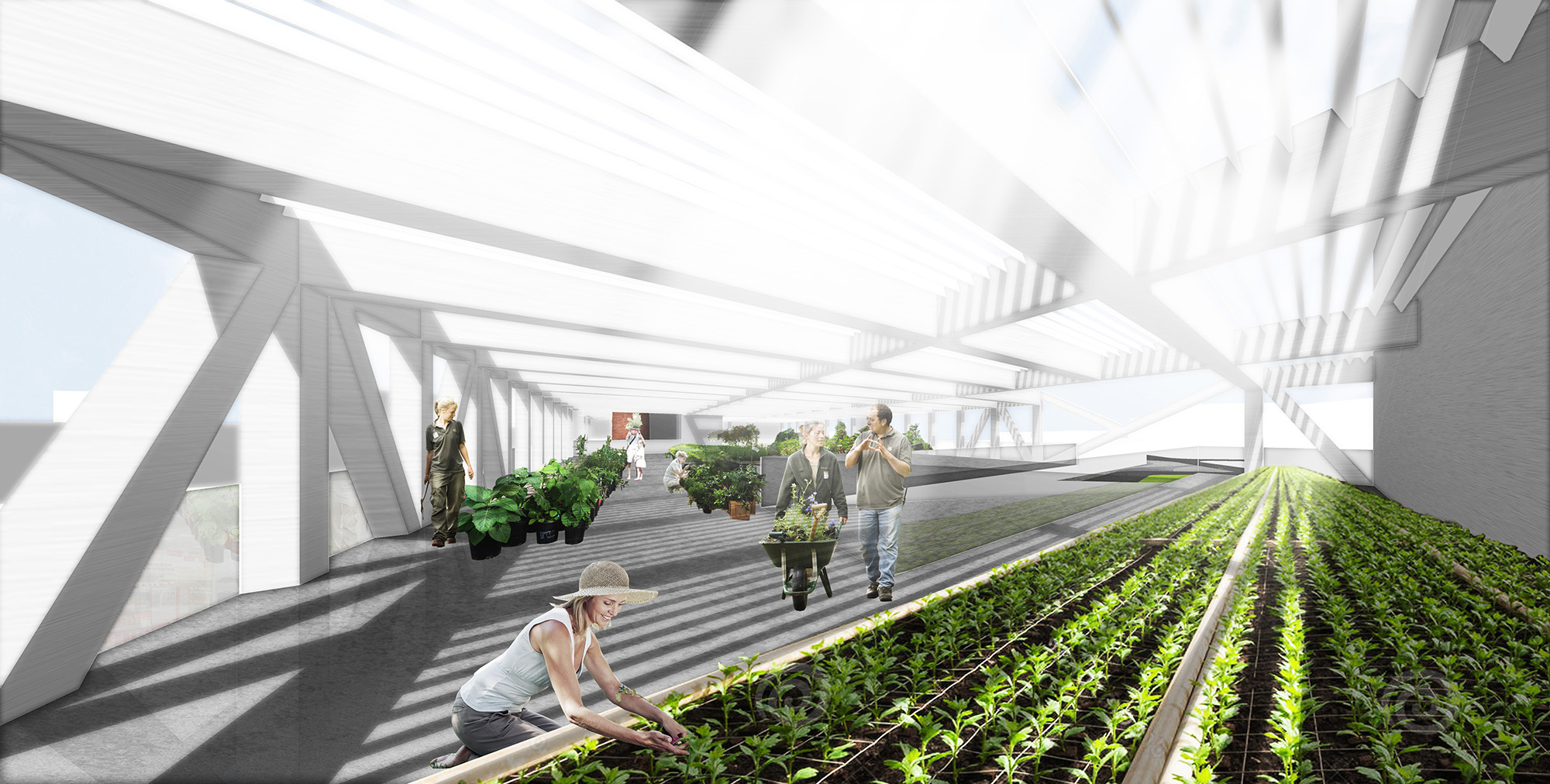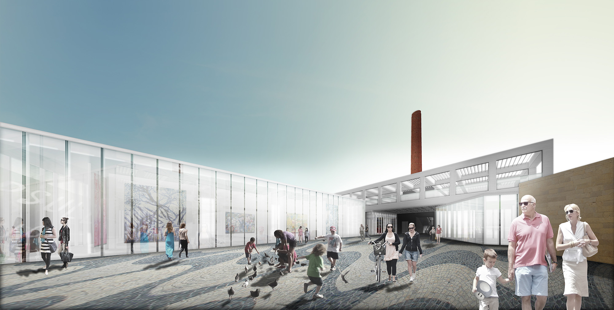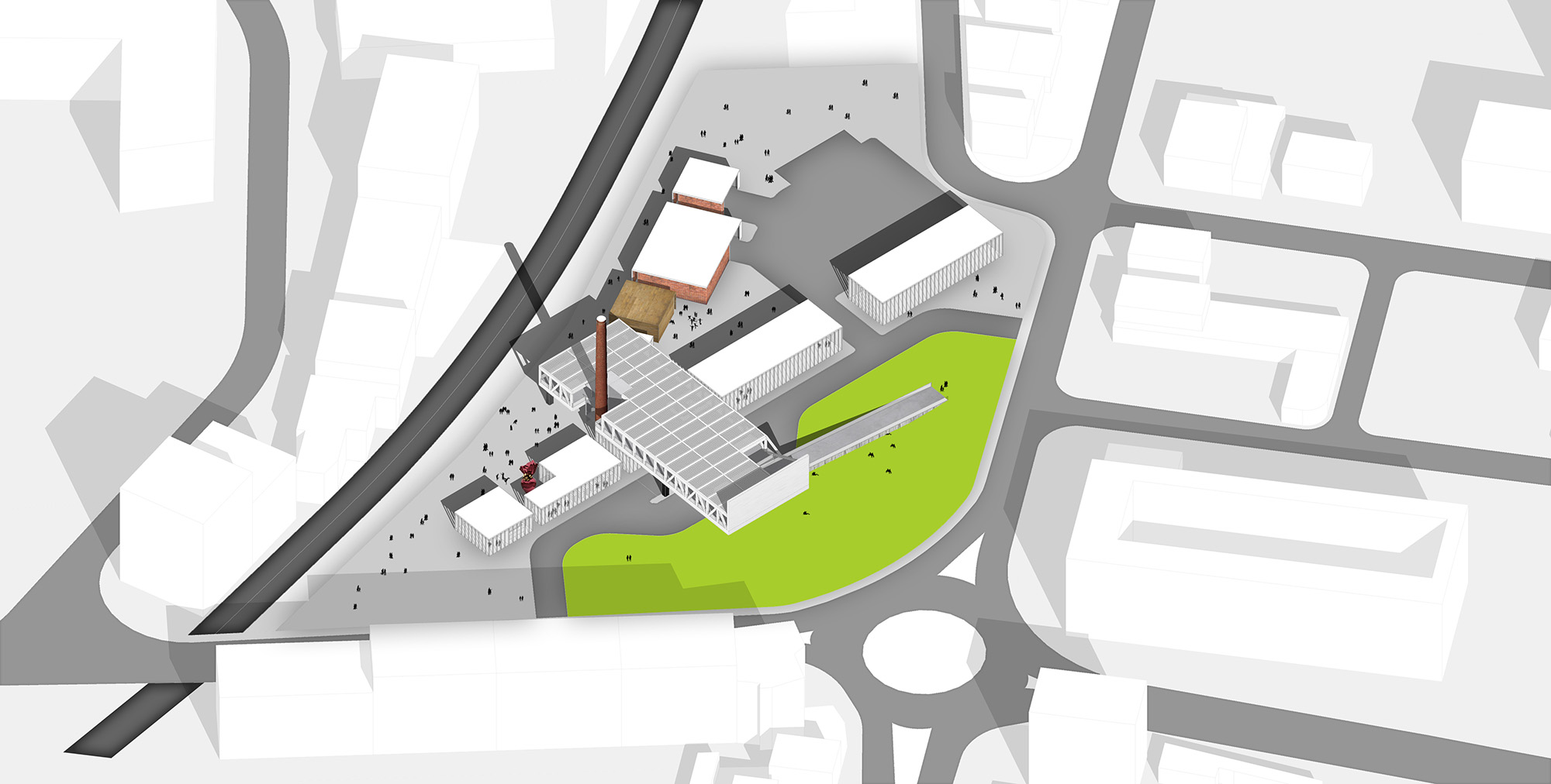 A plant nursery overhangs about these spaces, freeing the ground plane into three distinct bands while acting as a unifying element to the design. The entire design pivots around the disused chimney from the previous history of the site, a visual and historical anchor to the space.